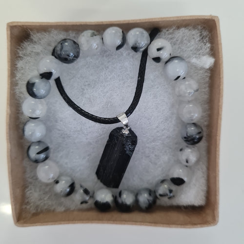 Black Tourmaline and Quartz Bracelet and Necklace Boxset