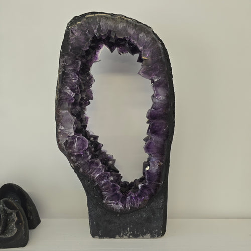 Geodes, unlike clusters, have all of their terminations located on the inside. They are typically rounded and show no sign of crystals on the outside unless they are broken in half.
