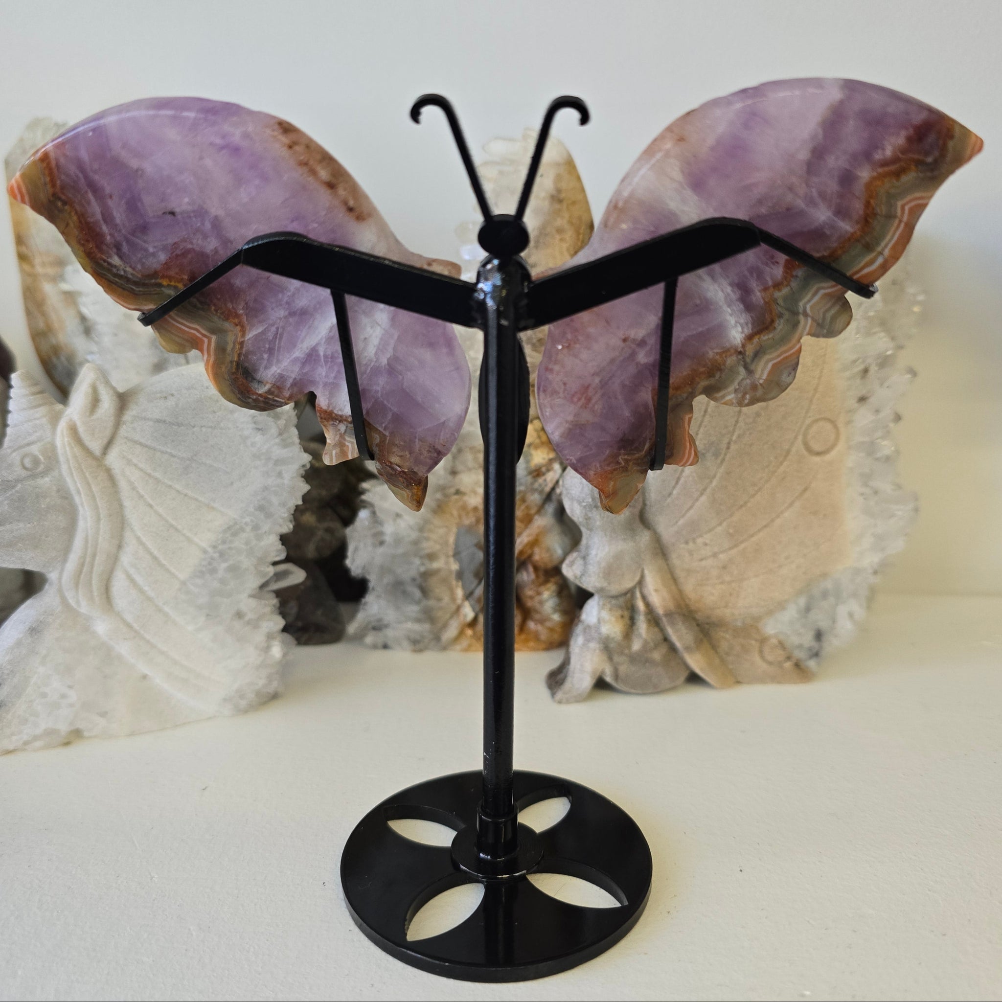 These pretty Amethyst Lace Agate Wings come with the butterfly stand. They are 211 g with the stand. The wings are approximately 9.25 x 5 cm x 50 mm. On the stand they are 13.5 cm tall.