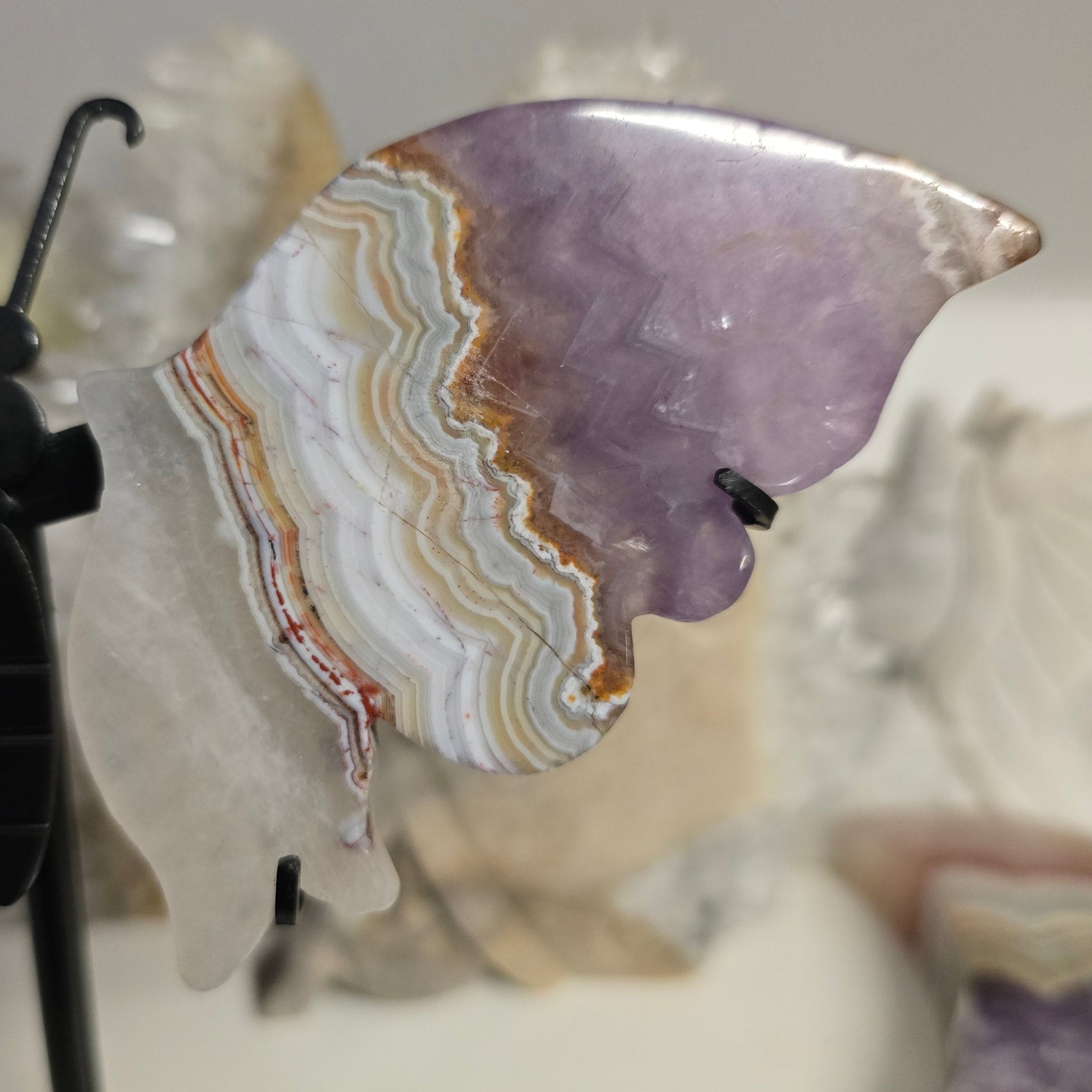 These pretty Amethyst Lace Agate Wings come with the butterfly stand. They are 221 g with the stand. The wings are approximately 10 x 5 cm x 60 mm. On the stand they are 14.25 cm tall.