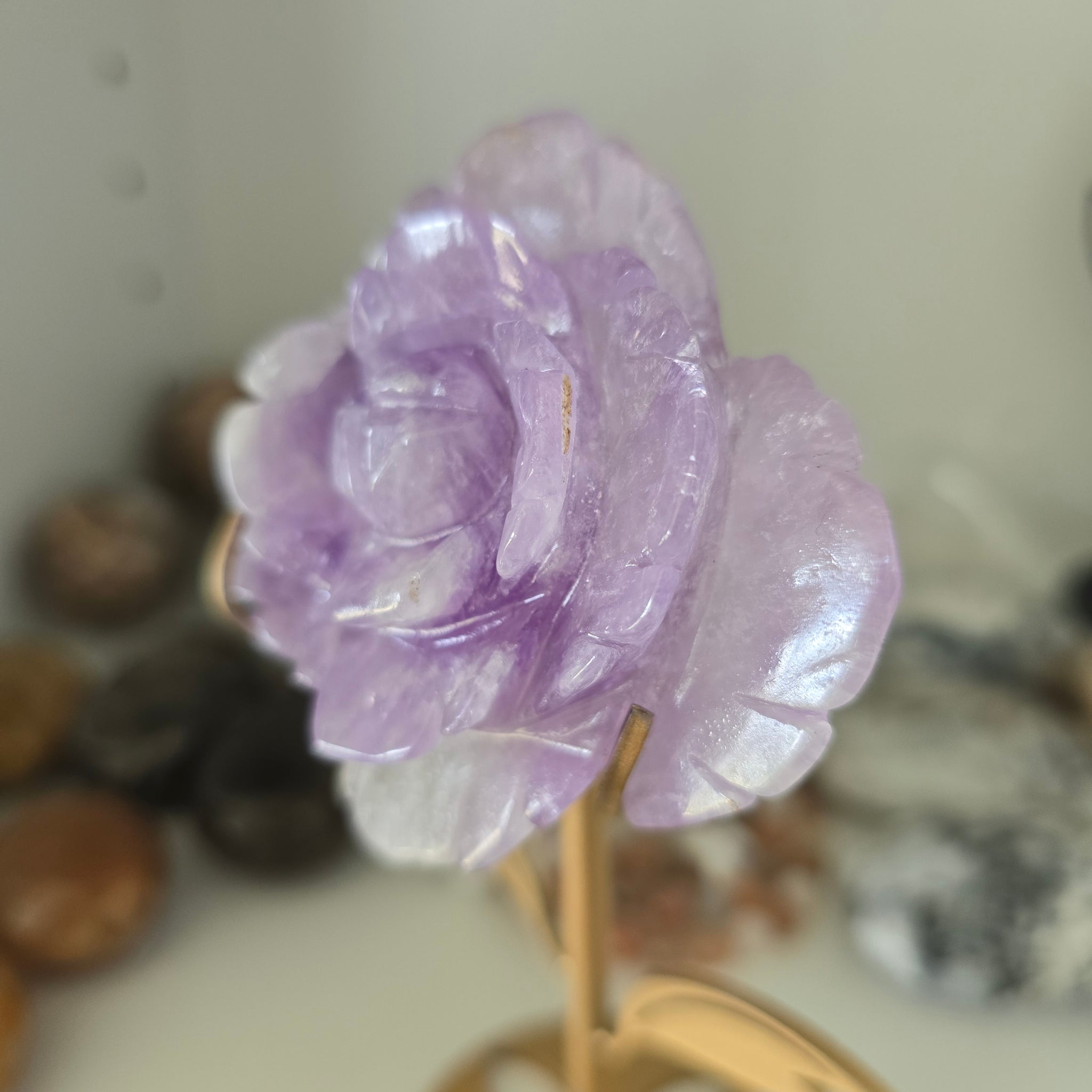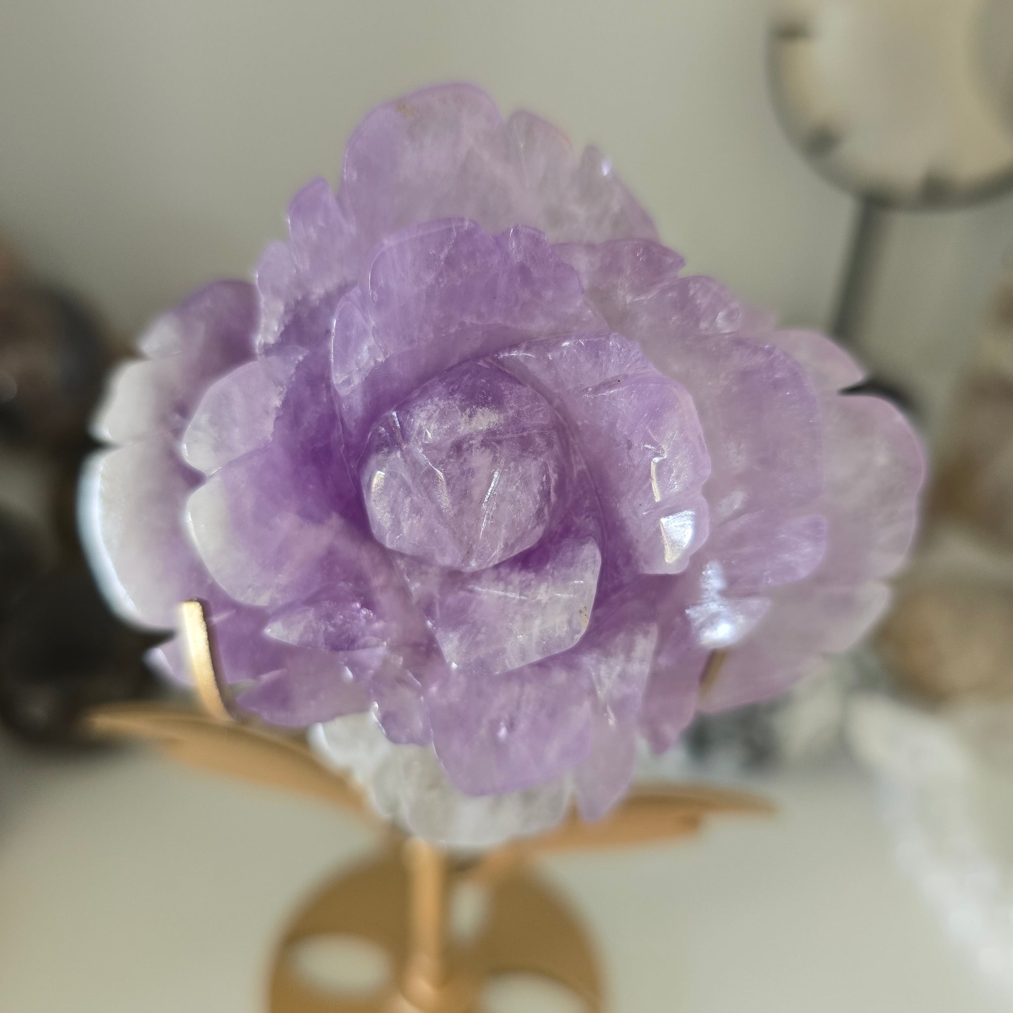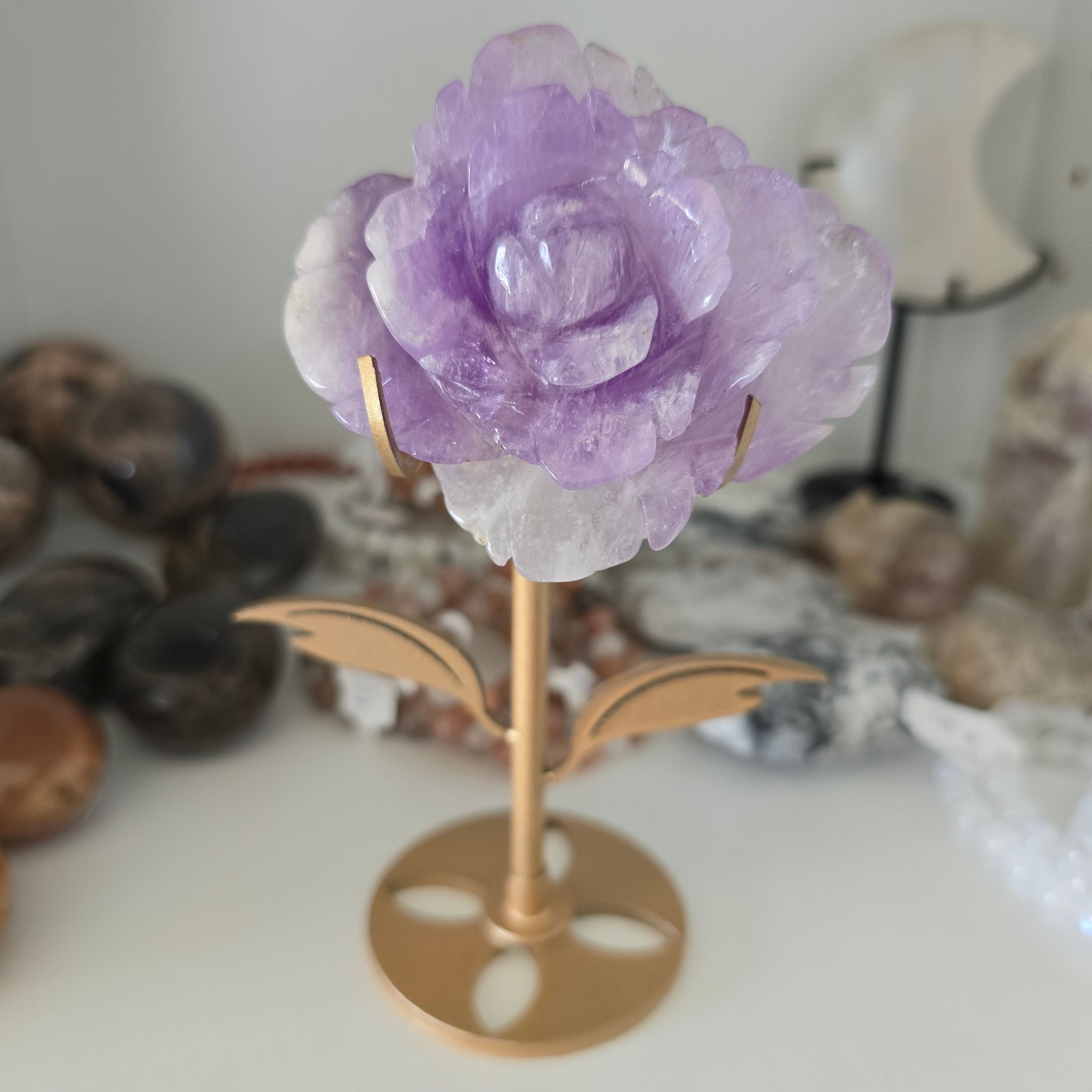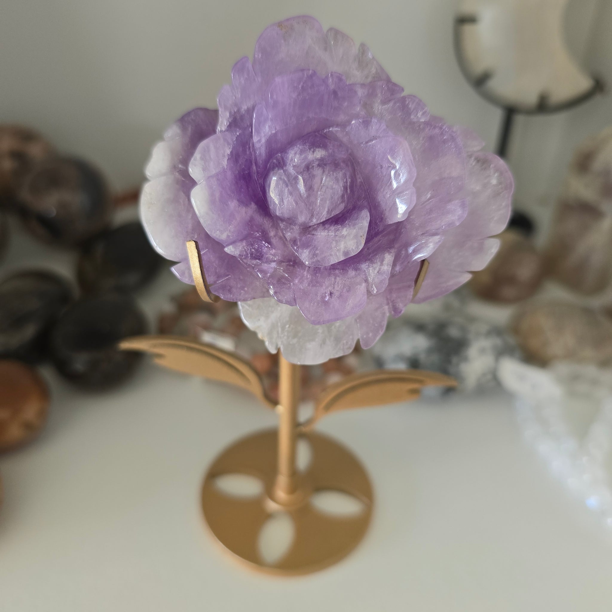 This detailed, carved Amethyst Rose comes with the stand. It is 224 g in total. The rose itself is127 g. The rose is approximately 7.5 x 6.5 x 2.5 cm. It is approximately 15.5 cm tall in the stand.