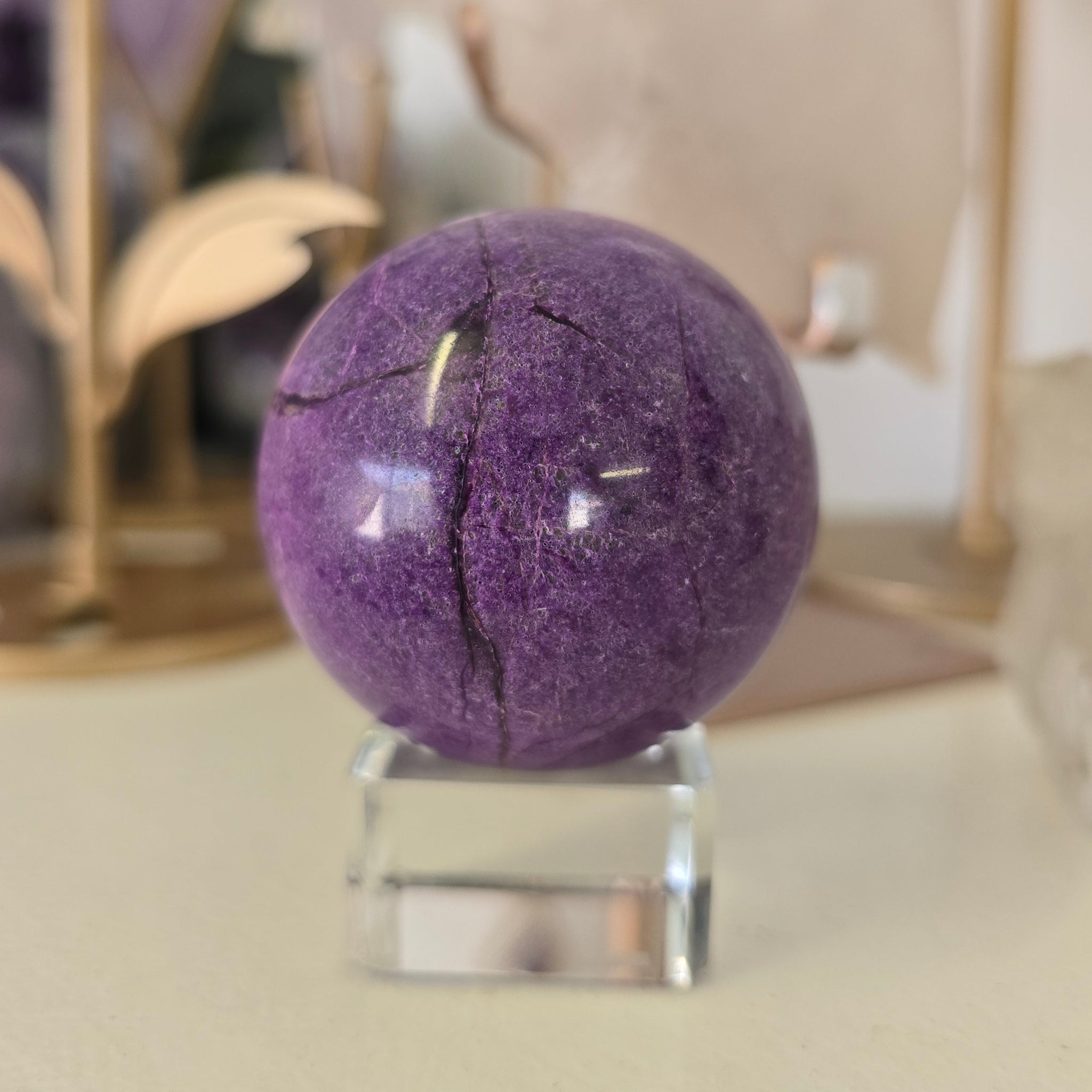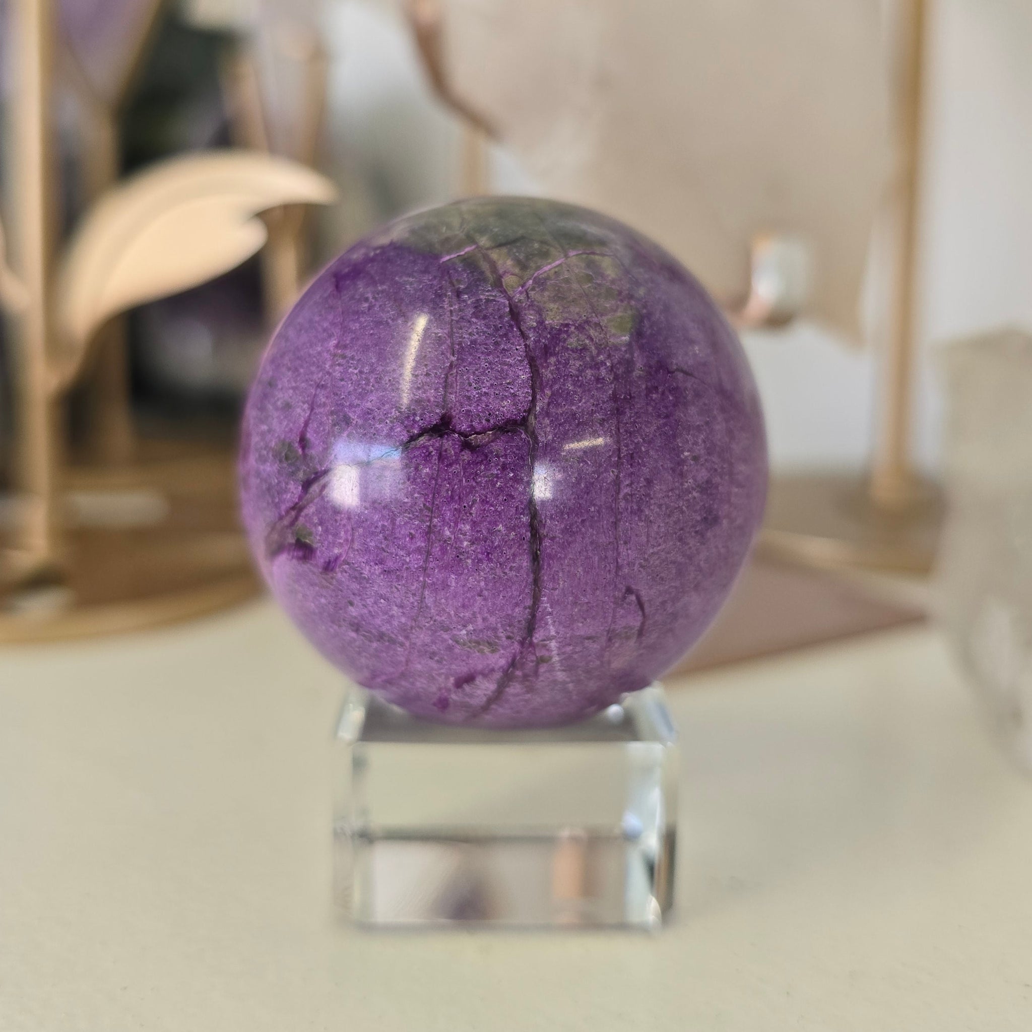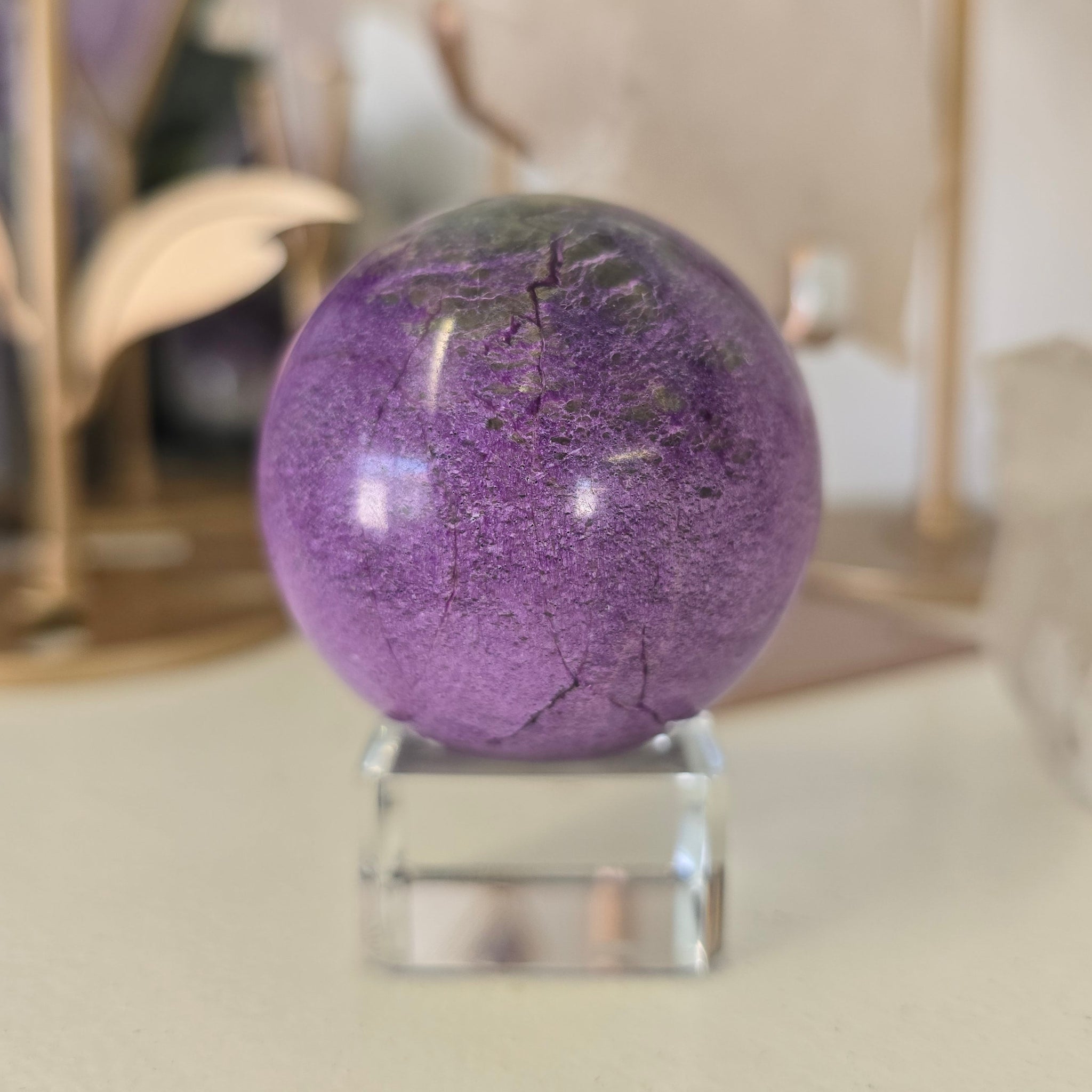 This beautiful Atlantisite Sphere is 124 g - approximately 4.25 cm in diameter. (Glass stand is not included).