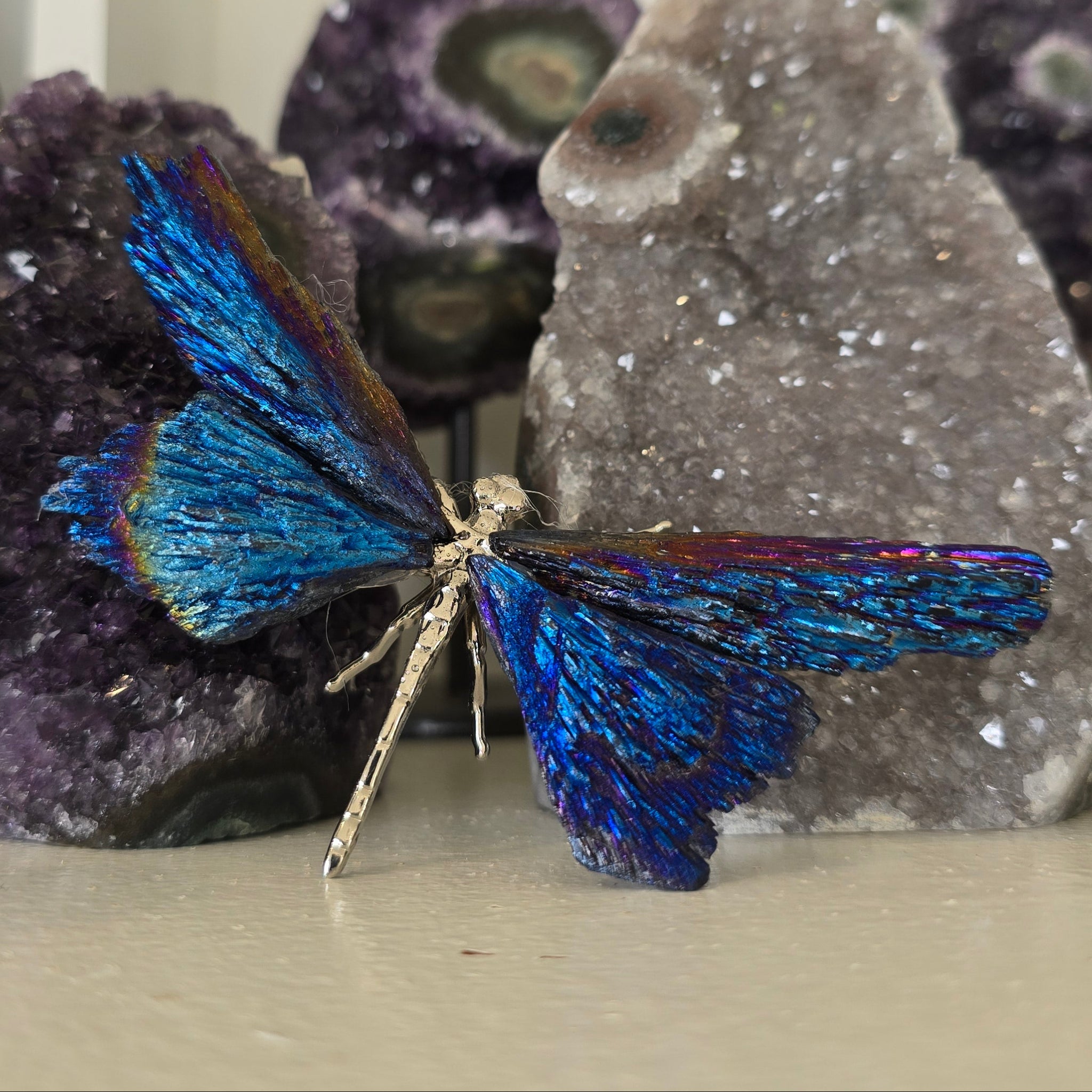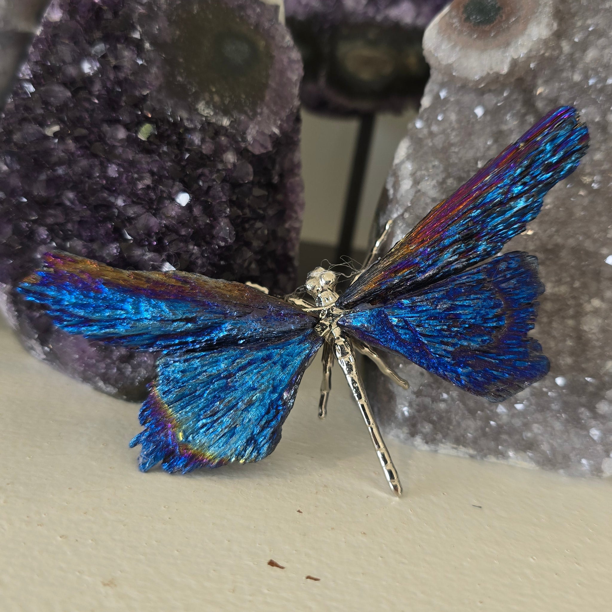 Pretty Aura Kyanite designed into a dragonfly on a silver-plated dragonfly body/stand. It is approximately 42 g - 10.5 x 4.5 x 2.5 cm.