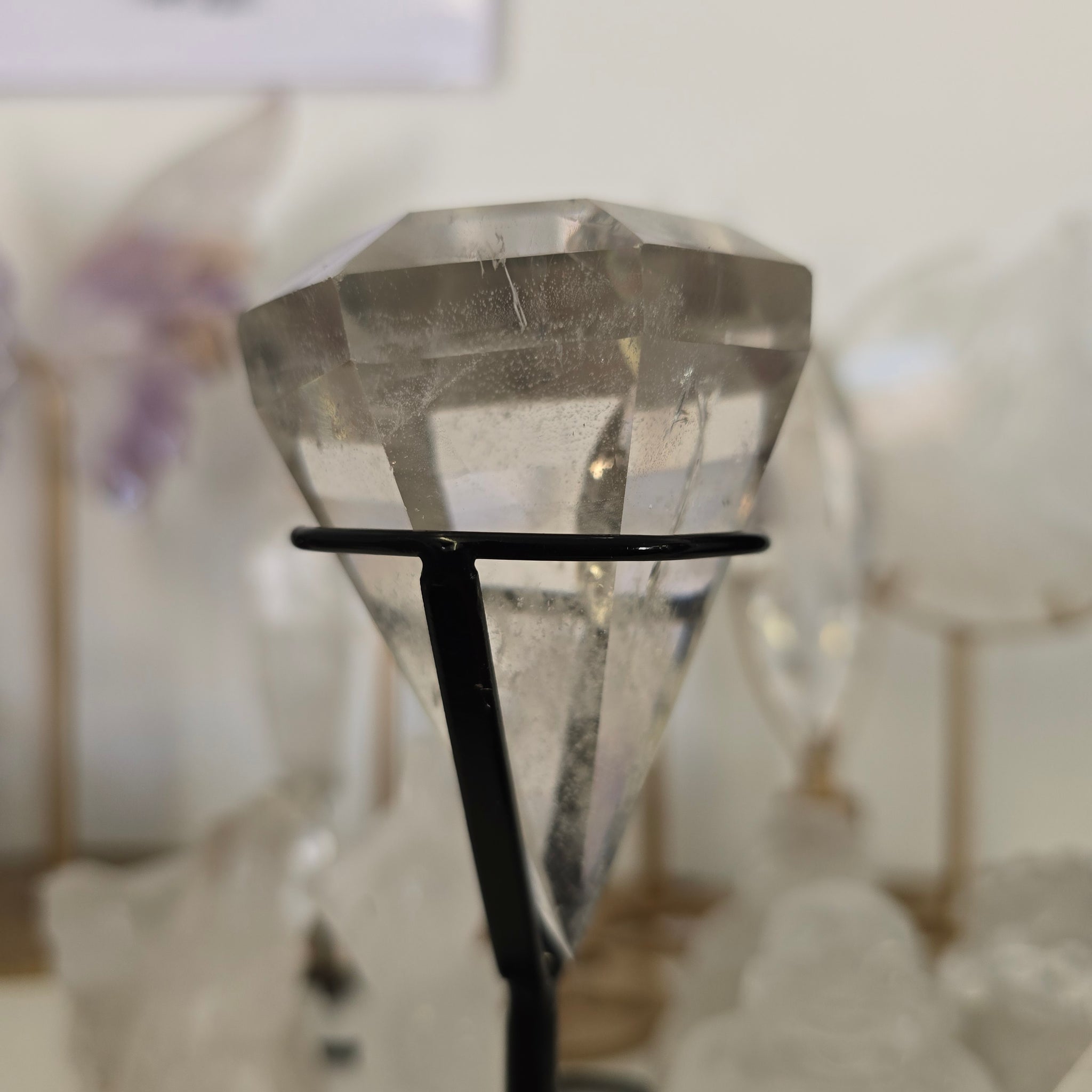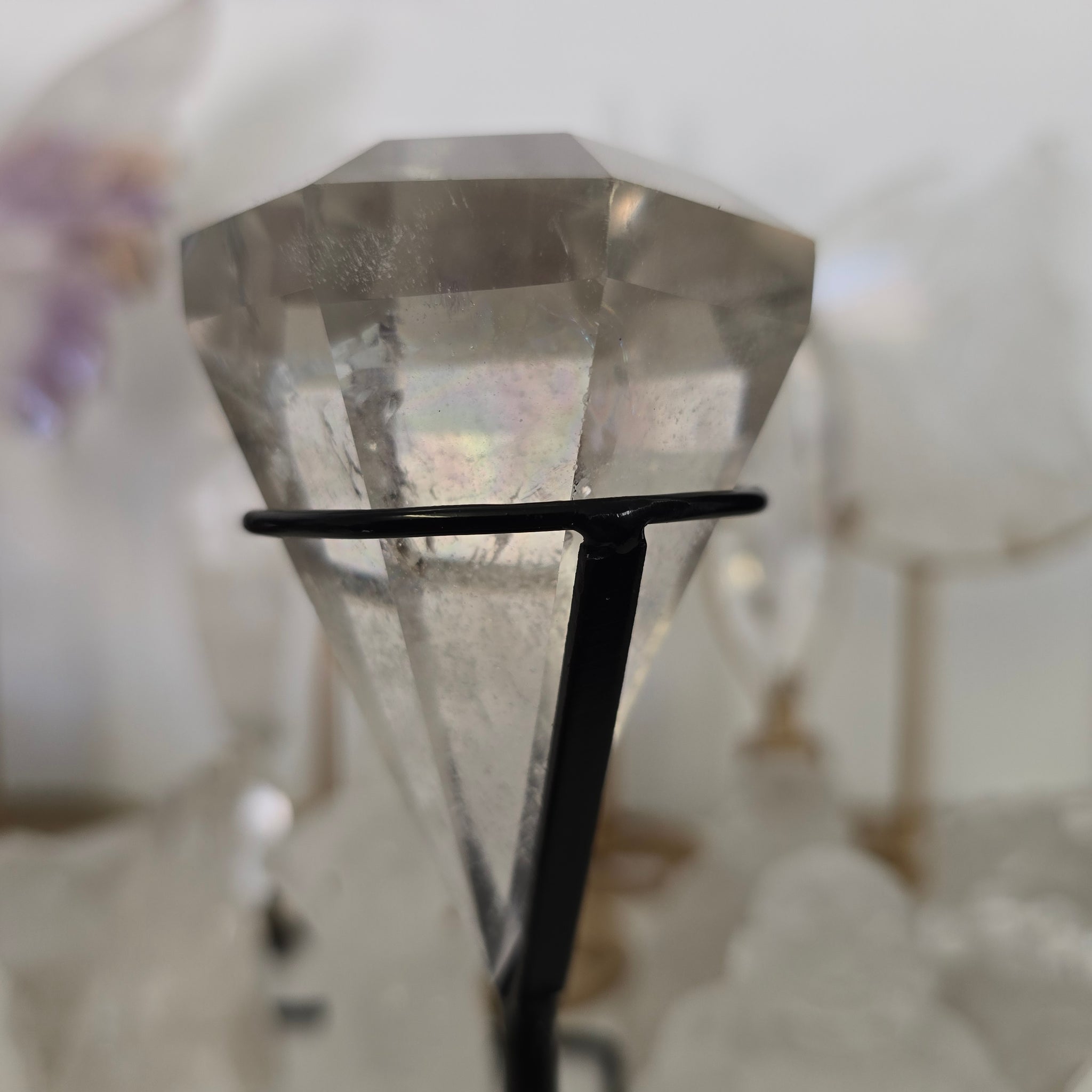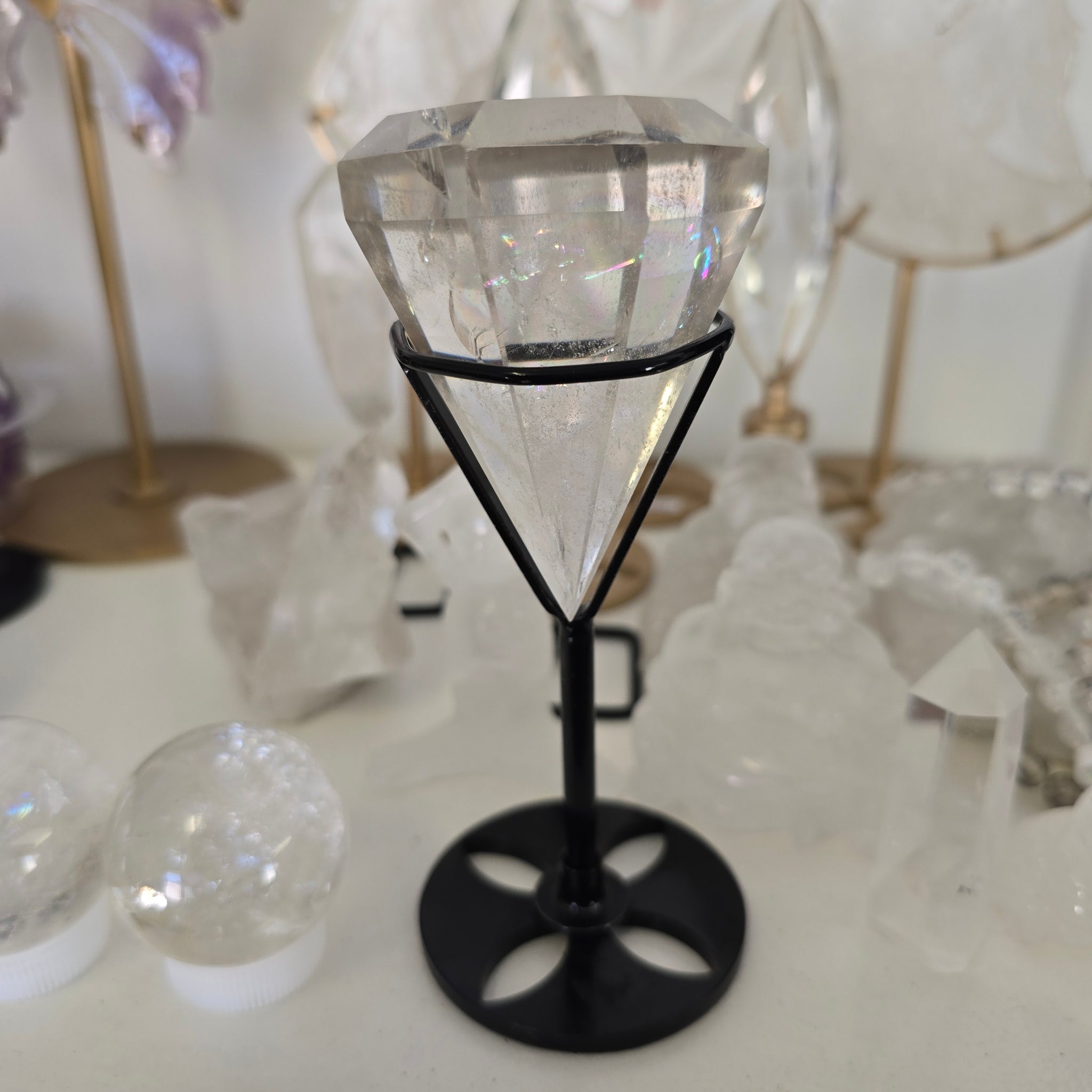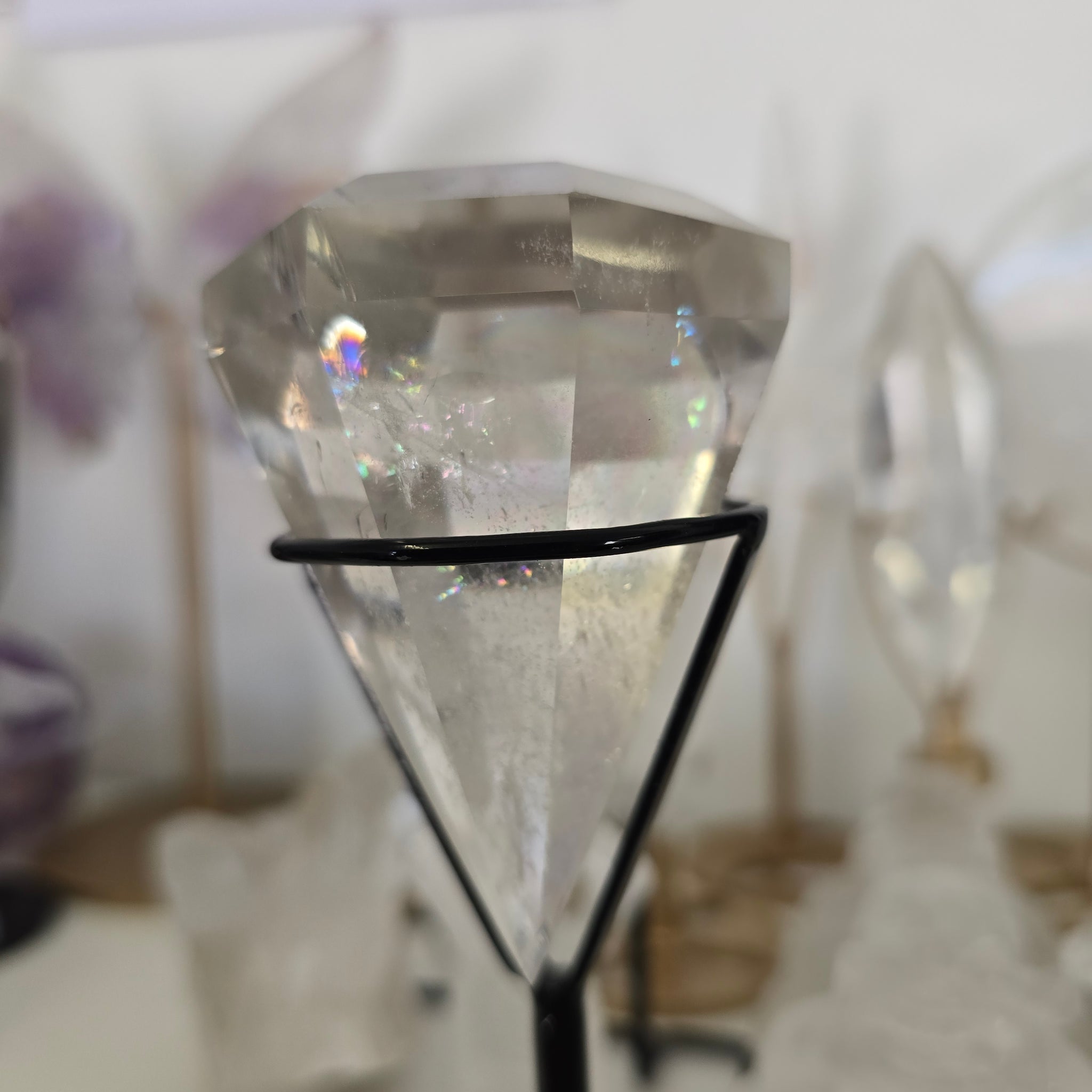 This gorgeous piece of Clear Quartz is cut in a faceted diamond shape and containsbeautifulrainbows. It comes with the stand. It is 277 g with stand and the crystal is 182 g on its own. It is approximately 7 x 5.25 cm. Stands 13.5 cm in the stand. (Stand is included)