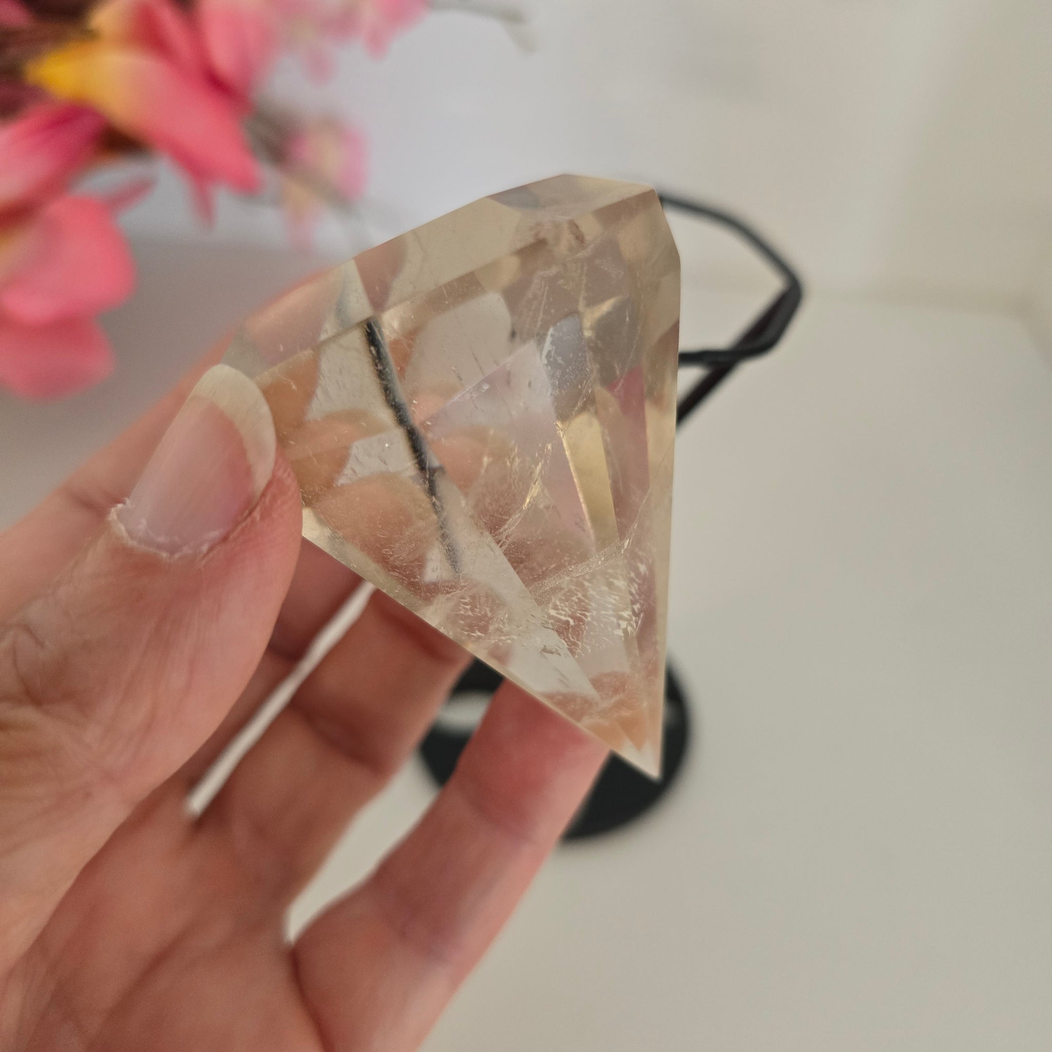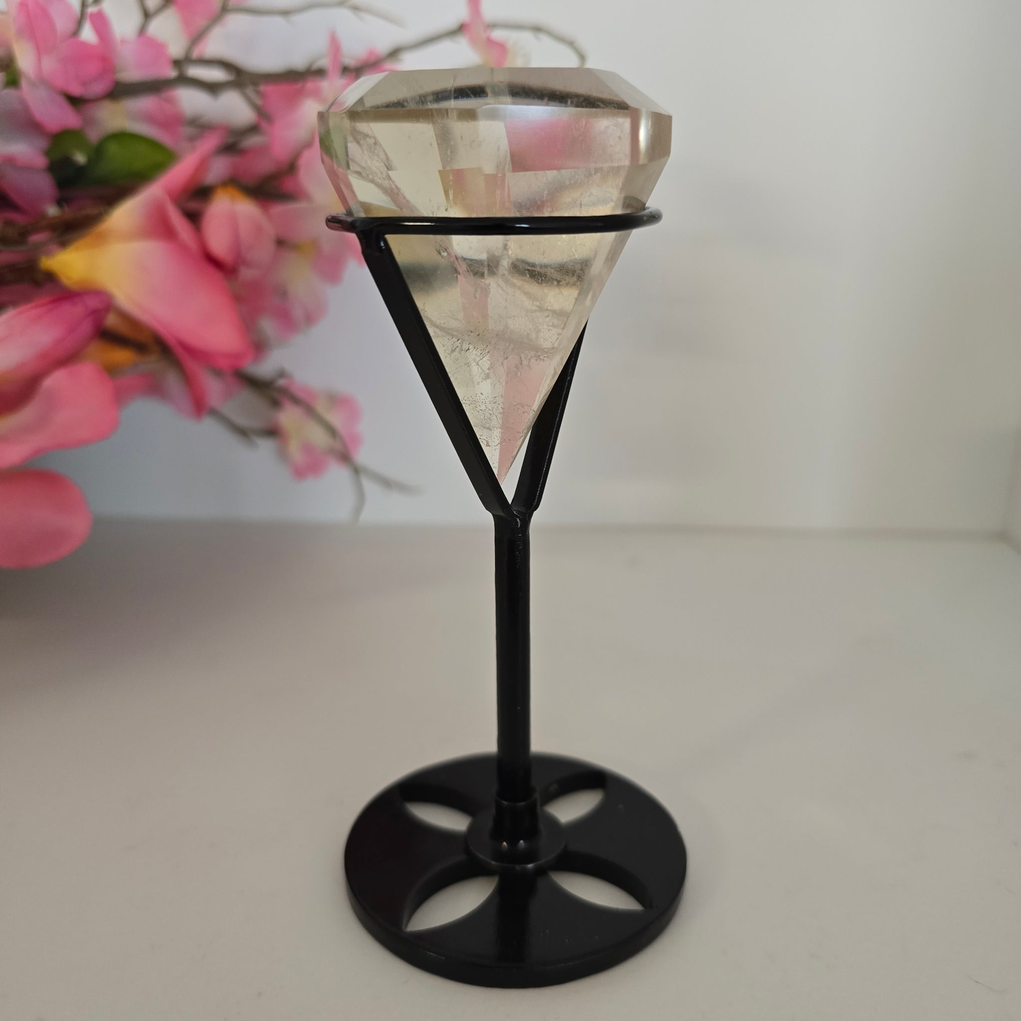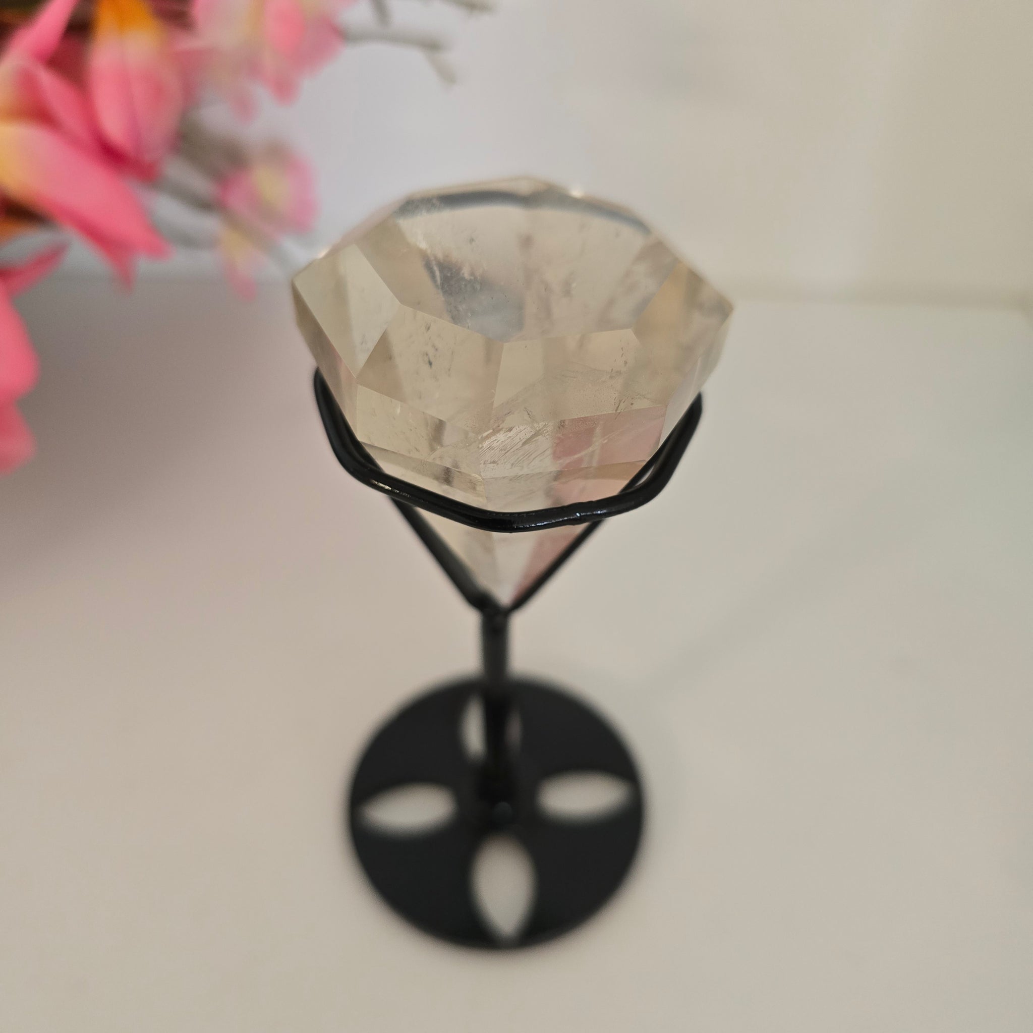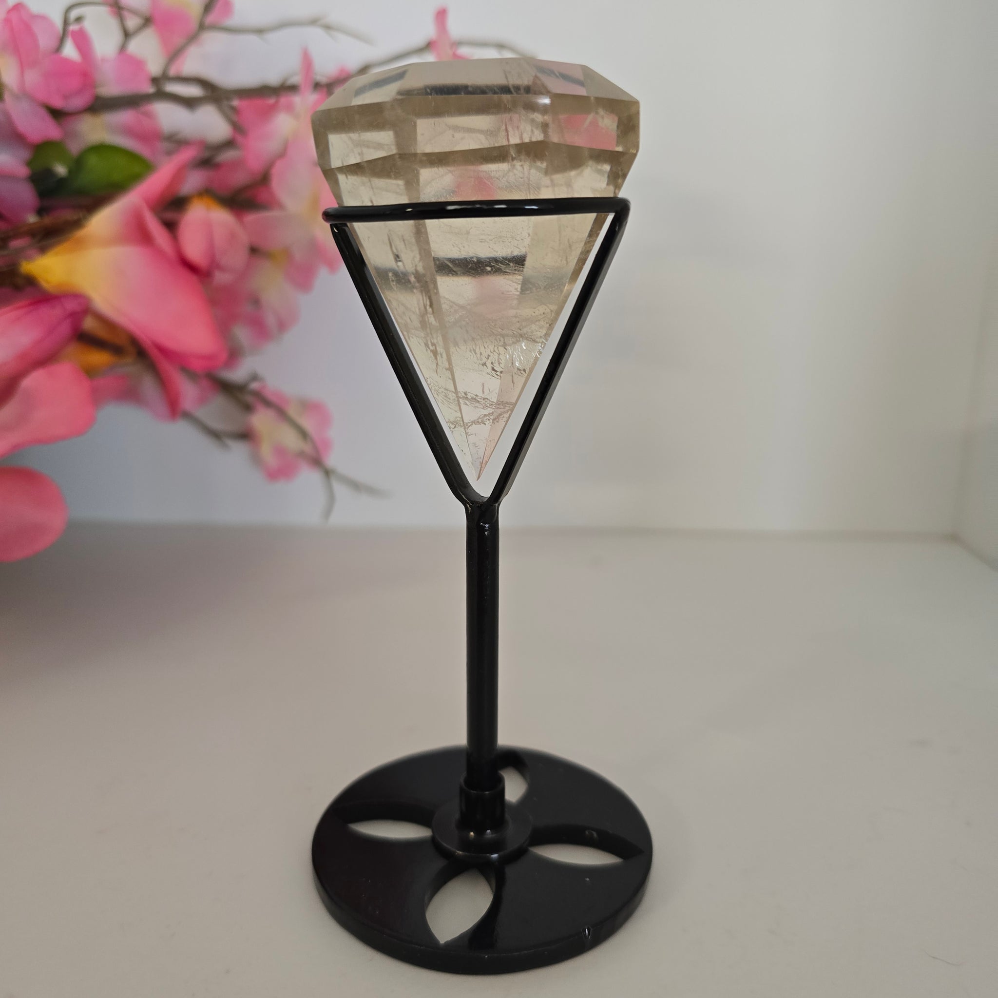 This gorgeous piece of Clear Quartz is cut in a faceted diamond shape. It comes with the stand. It is 214 g with stand and the crystal is 119 g on its own. It is approximately 4.25 x 6 cm. Stands 13 cm in the stand. (Stand is included)