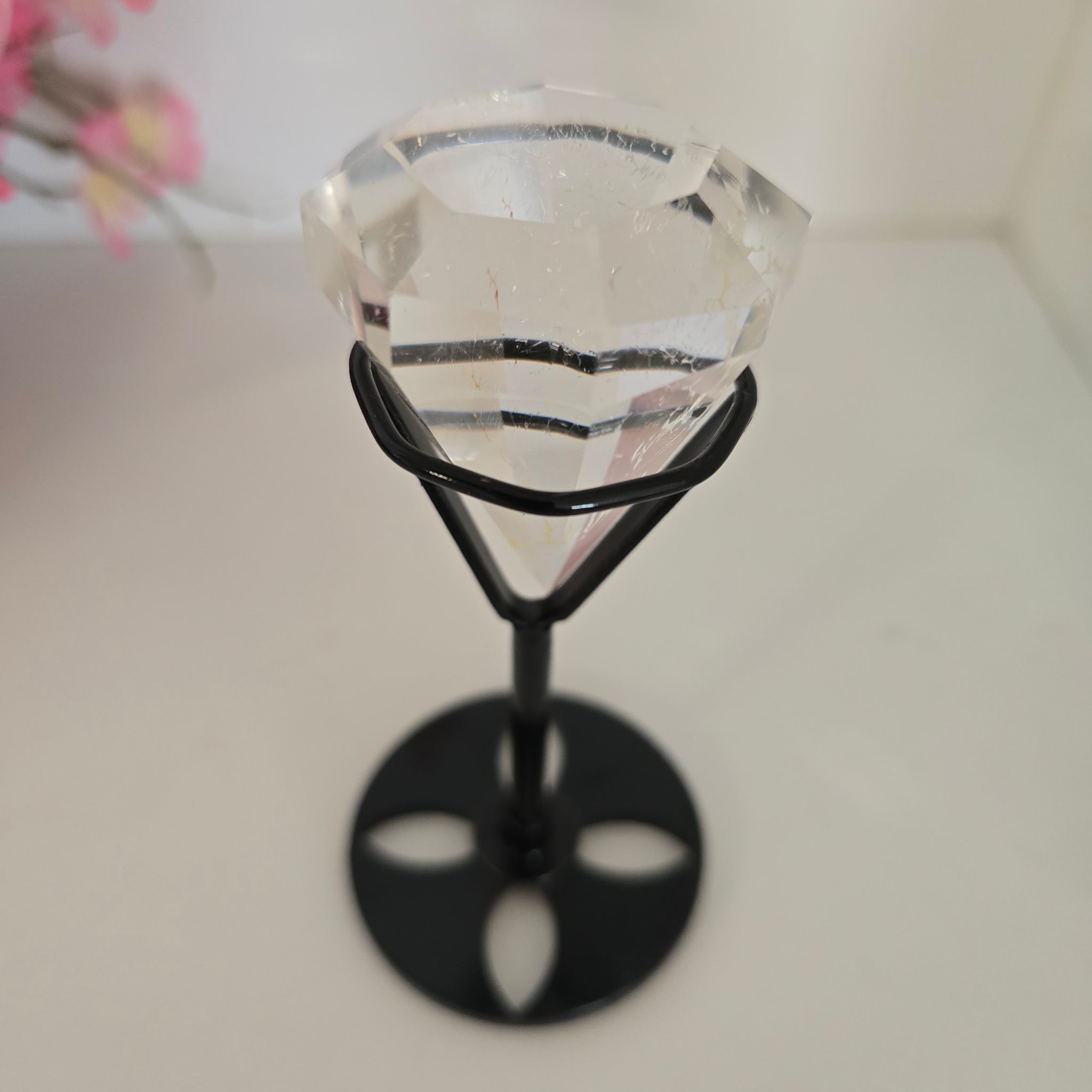 This gorgeous piece of Clear Quartz is cut in a faceted diamond shape. It comes with the stand. It is 188 g with stand and the crystal is 95 g on its own. It is approximately 4.25 x 5.25 cm. Stands 13.5 cm in the stand. (Stand is included)
