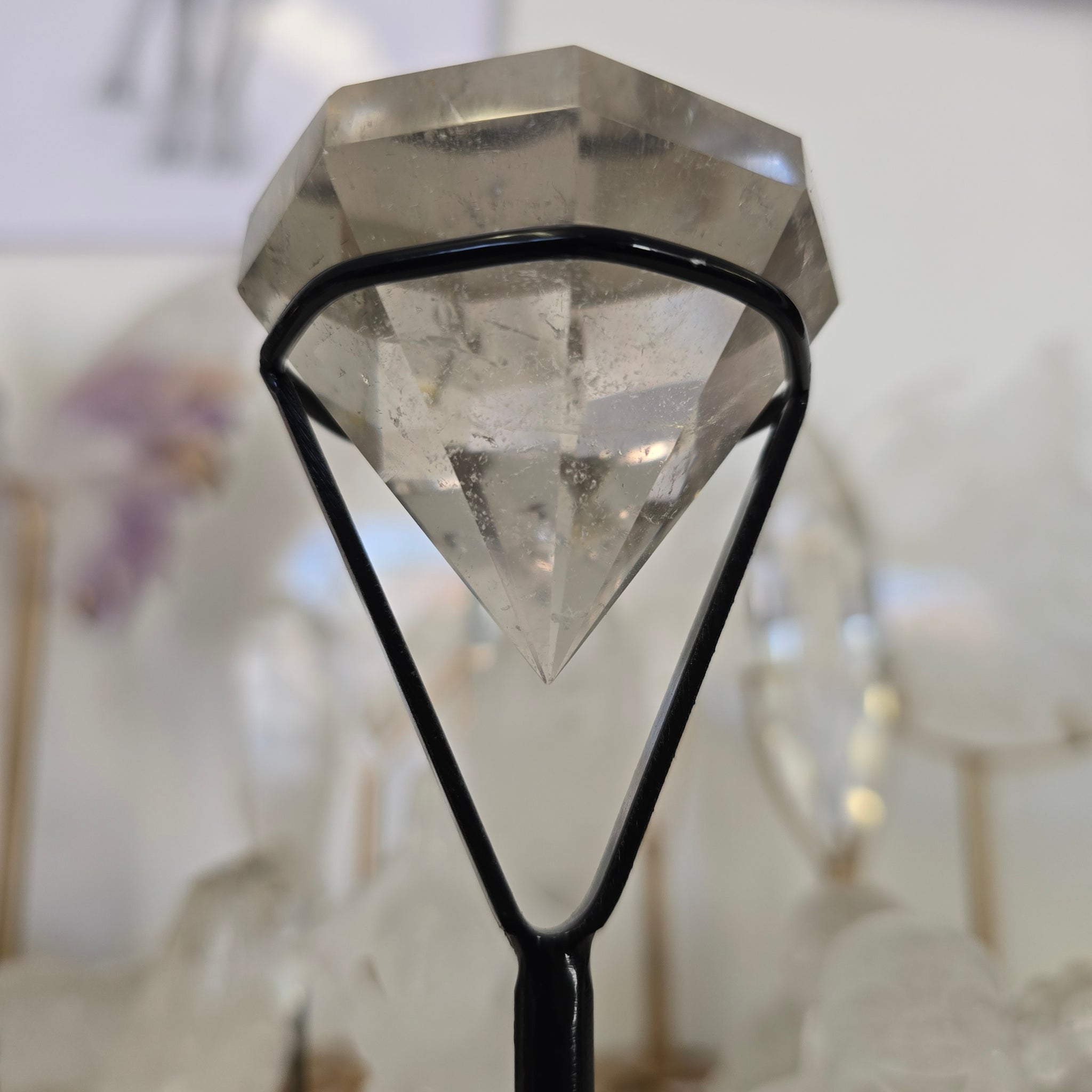 This gorgeous piece of Clear Quartz is cut in a faceted diamond shape and containsbeautifulrainbows. It comes with the stand. It is 203 g with stand and the crystal is 108 g on its own. It is approximately 4.25 x 4.75 cm. Stands 12.5 cm in the stand. (Stand is included)