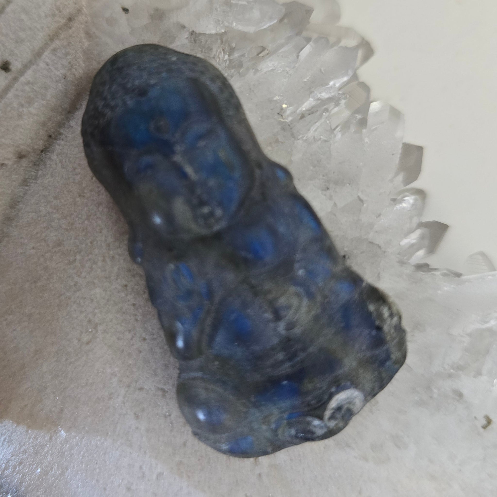 This flashy carved Labradorite Buddha is 16 g - approximately 4.25 x 2 cm x 75 mm.