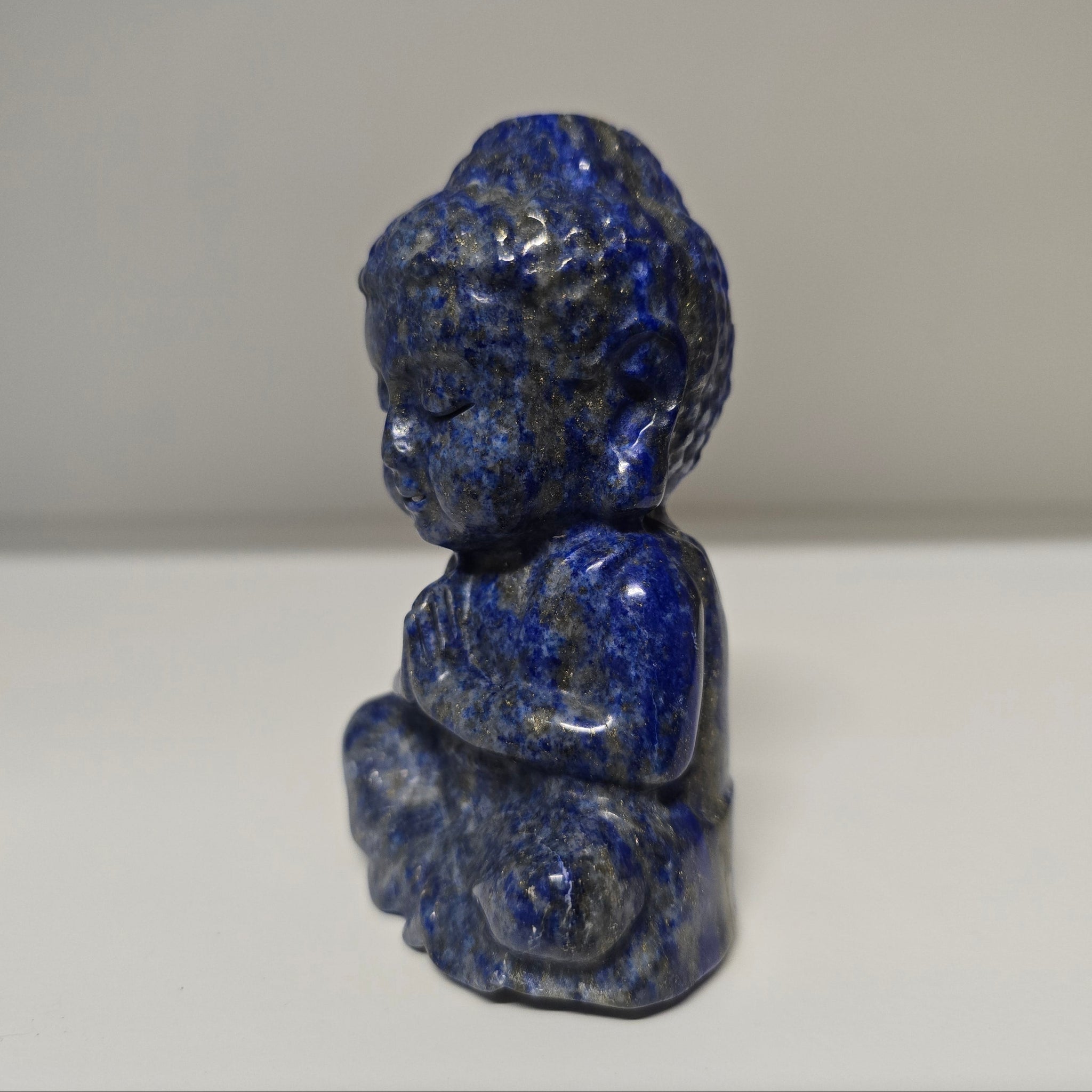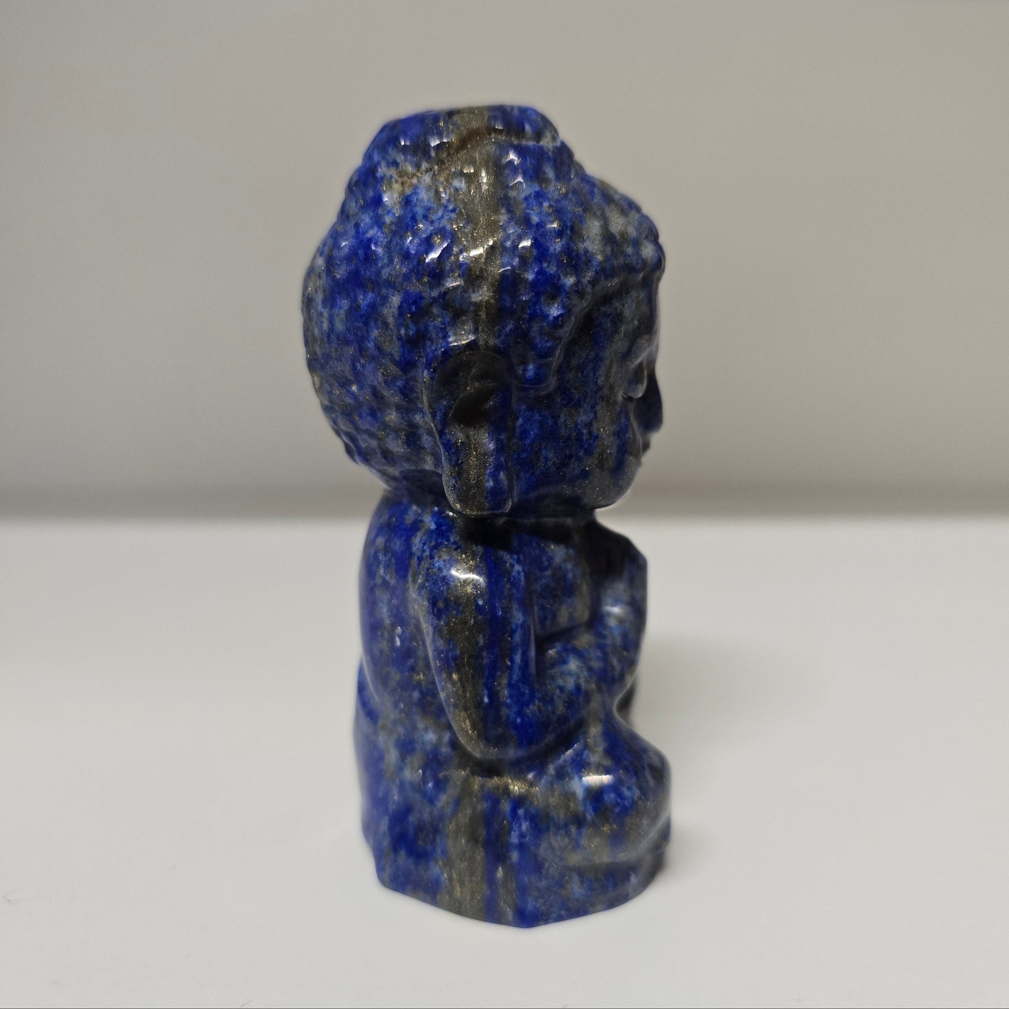 This Lapis Lazuli Buddha is approximately 379 g - 9.75 x 5.5 x 4.25 cm.