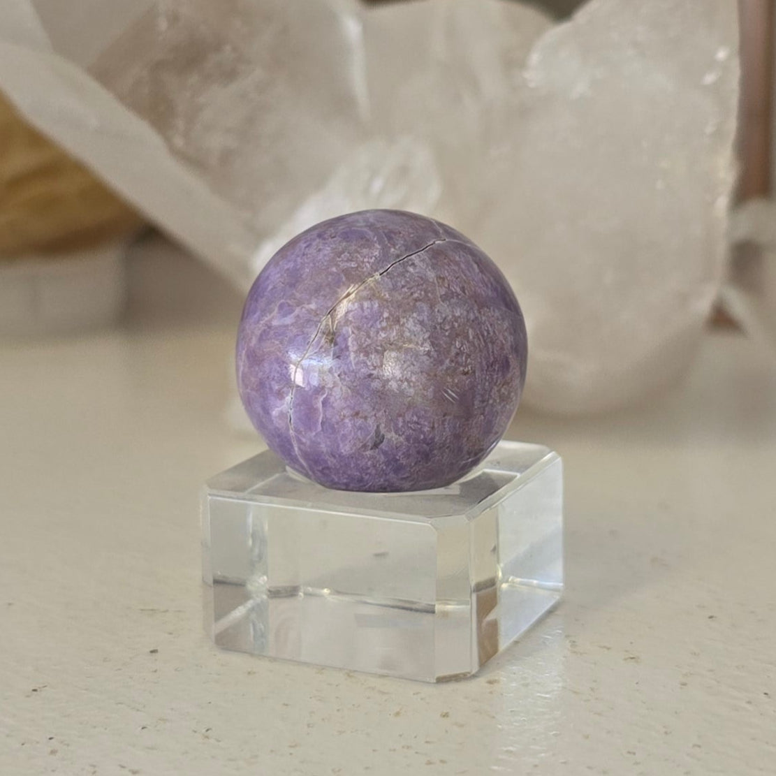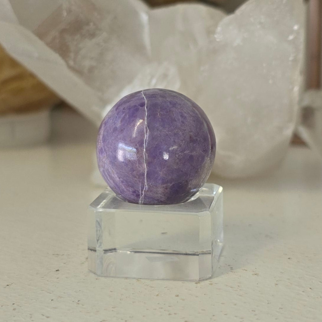 This beautiful Lavender Jade Sphere is 24 g approximately 2.25 cm in diameter. (Glass stand is not included).