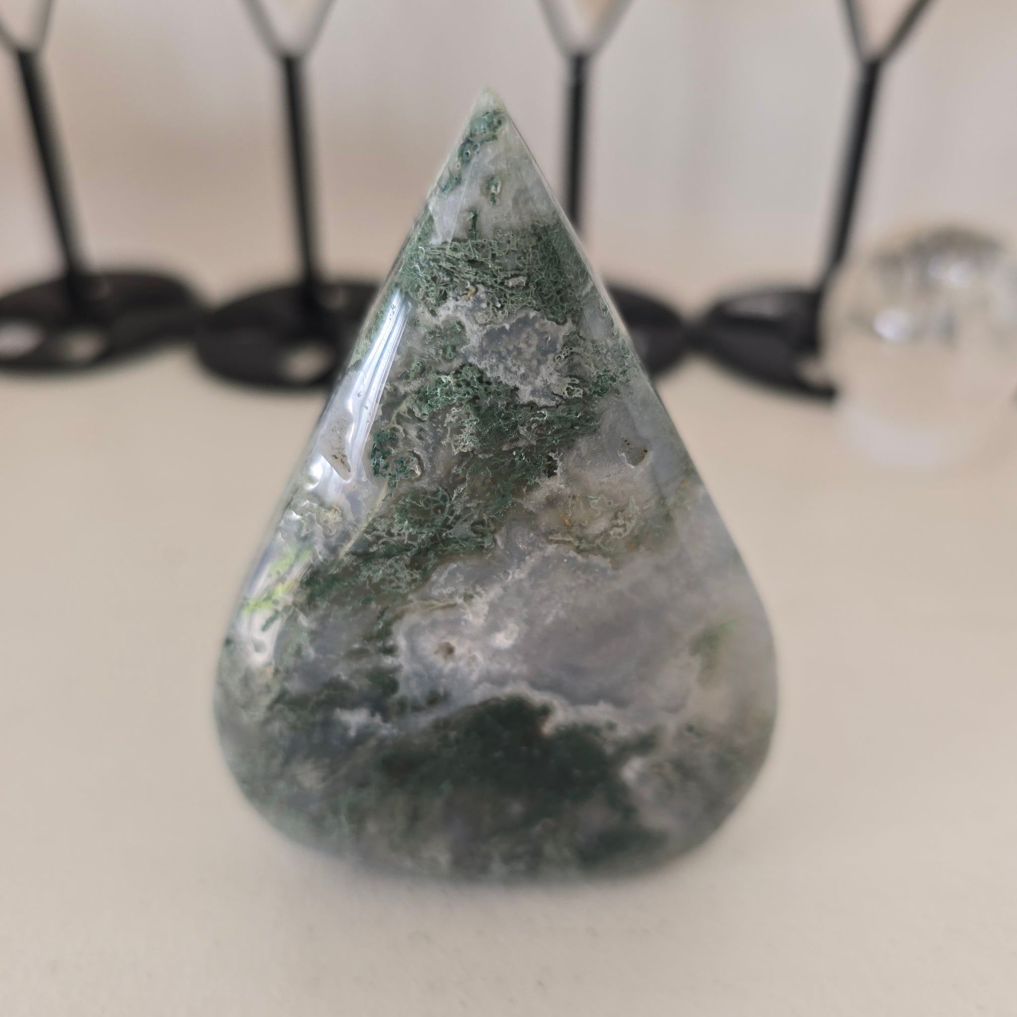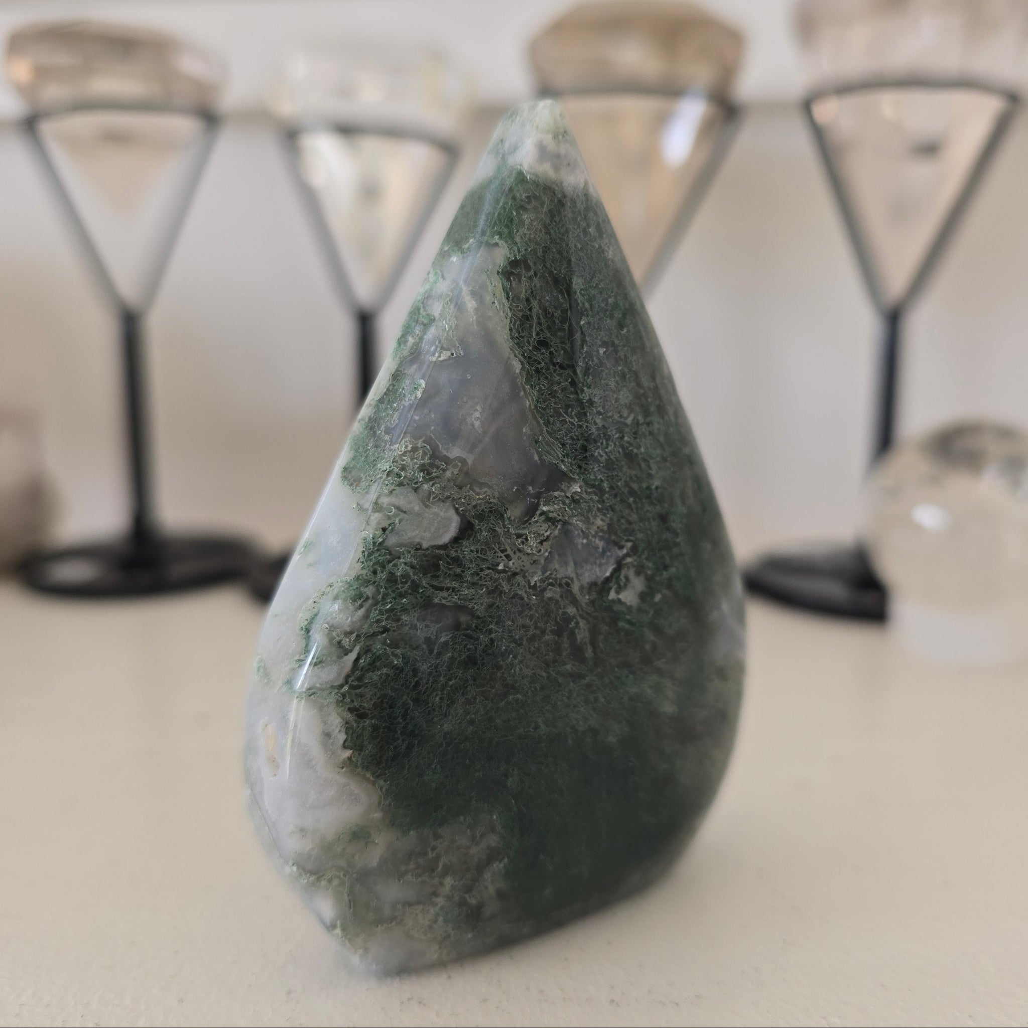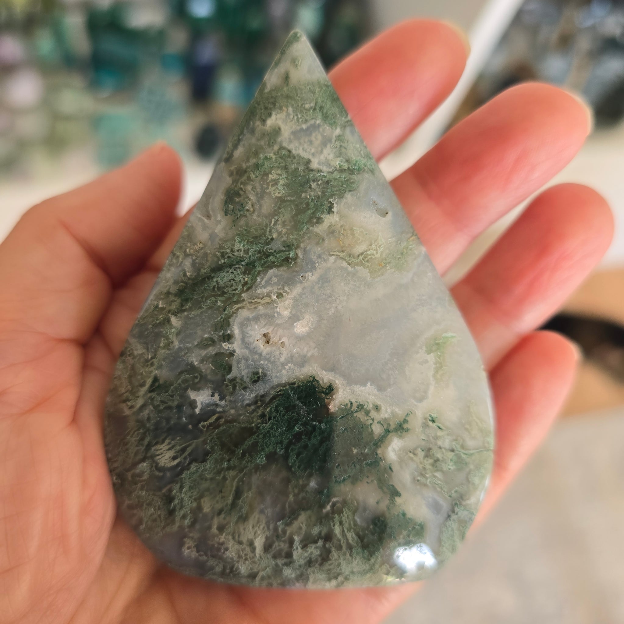 This beautiful Moss Agate Flame is 157 g. -approximately 8.5 x 6 x 1.5 cm.