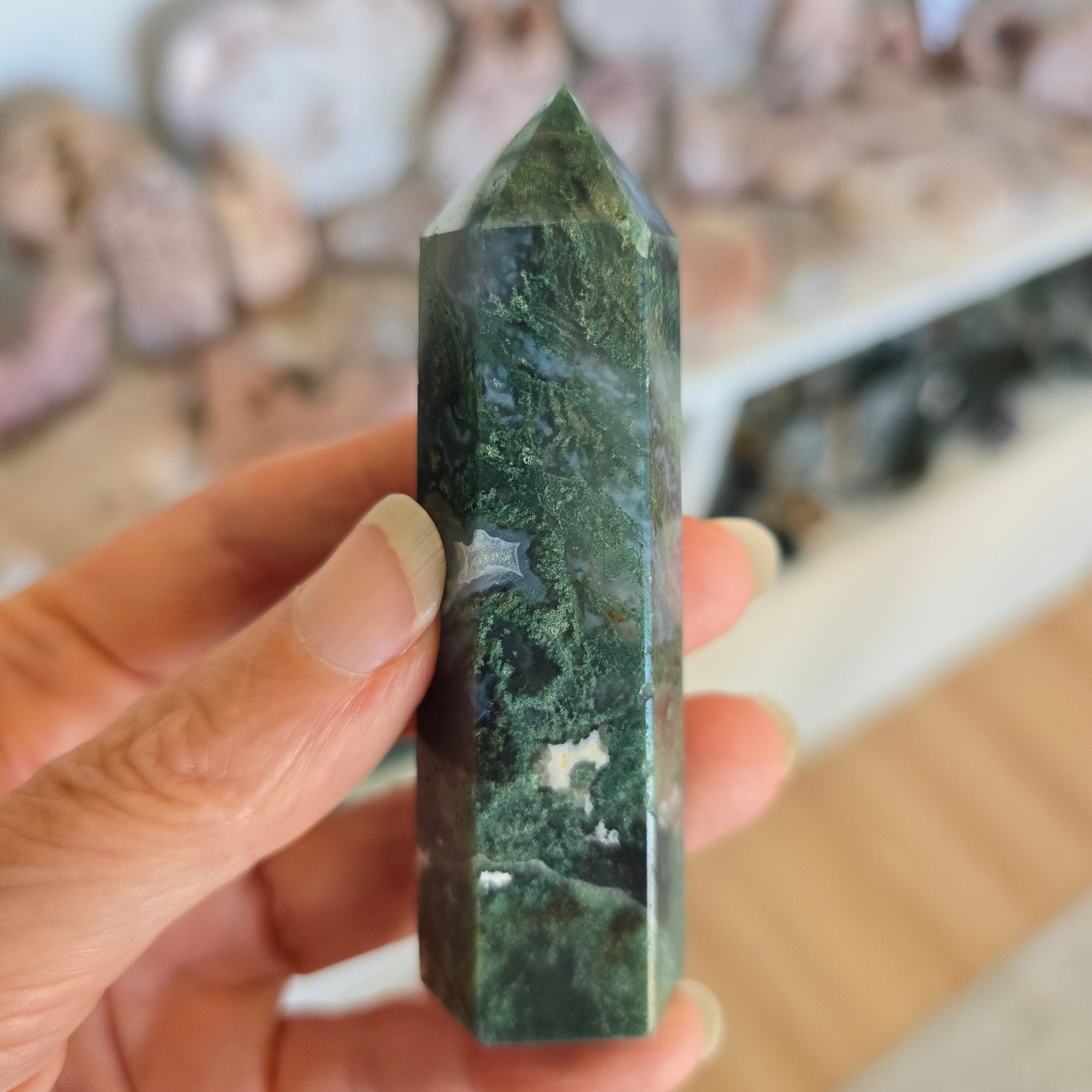 This beautiful Druzy Moss Agate Tower has gorgeous markings and has 6 sides. It is approximately 8.5 x 2.25 x 2 cm - 82 g