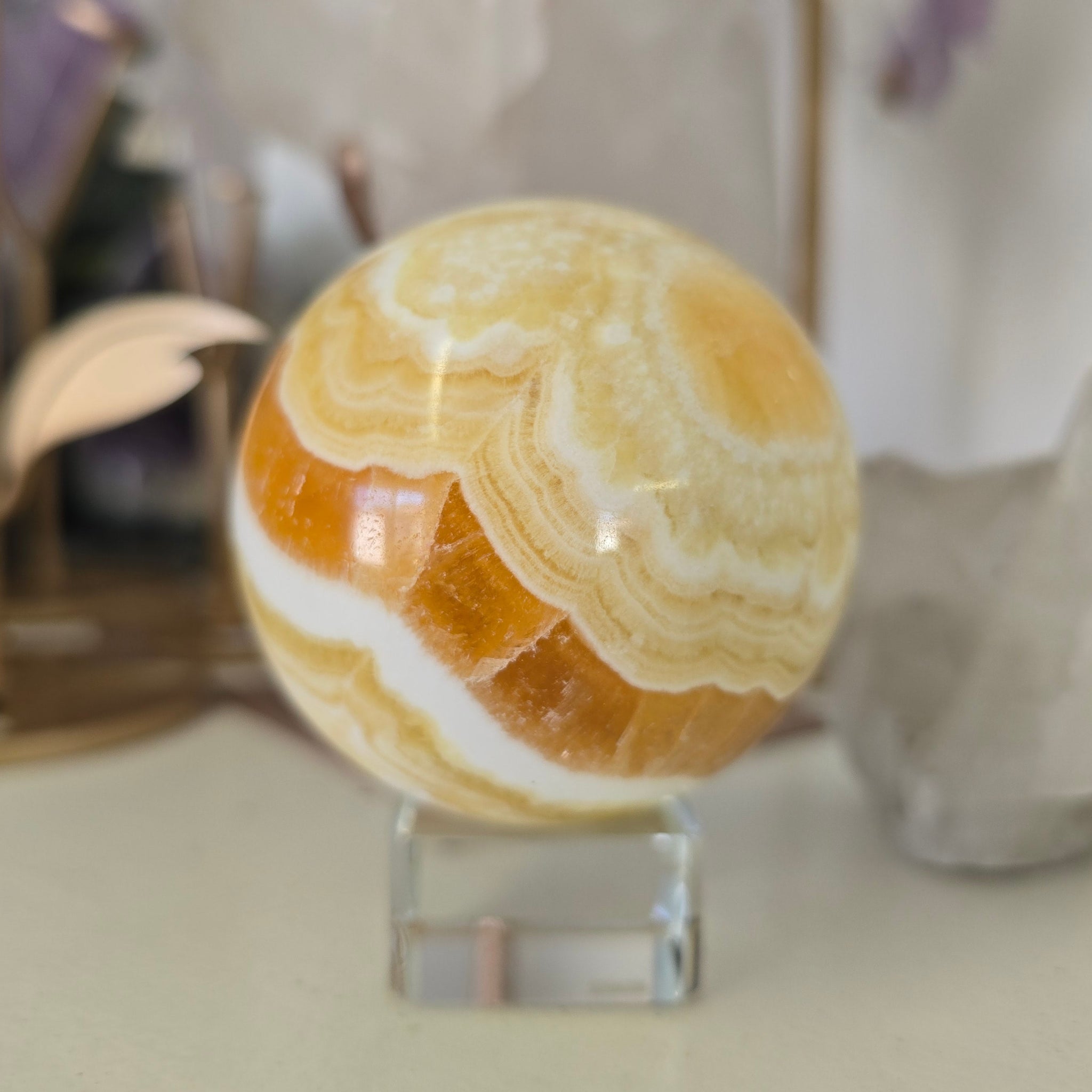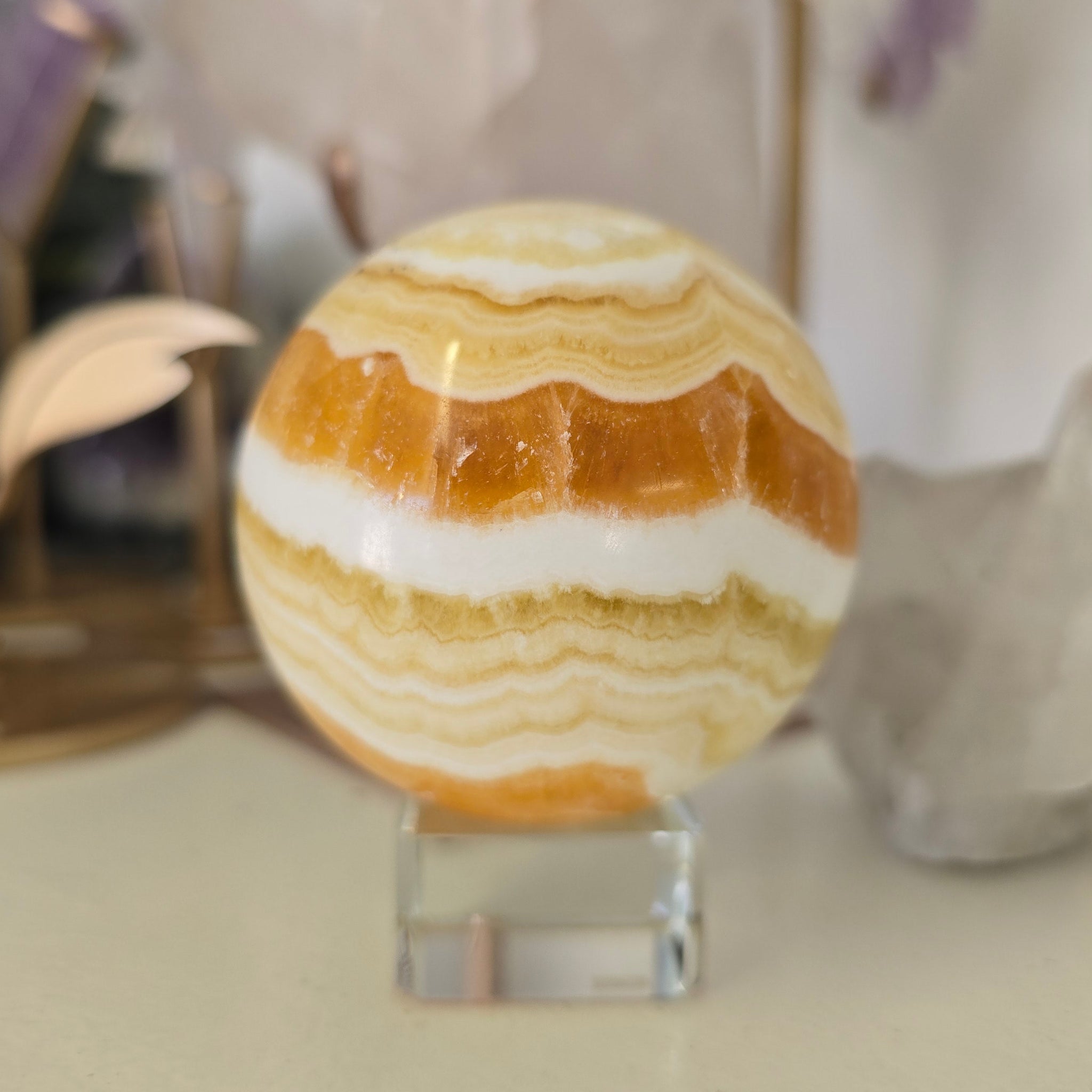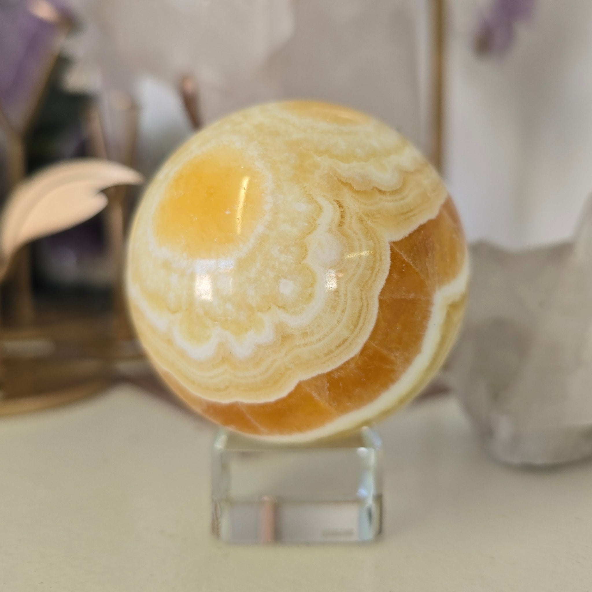 This beautiful Orange Calcite Sphere is 323 g - approximately 5.5 cm in diameter. (Glass stand is not included).