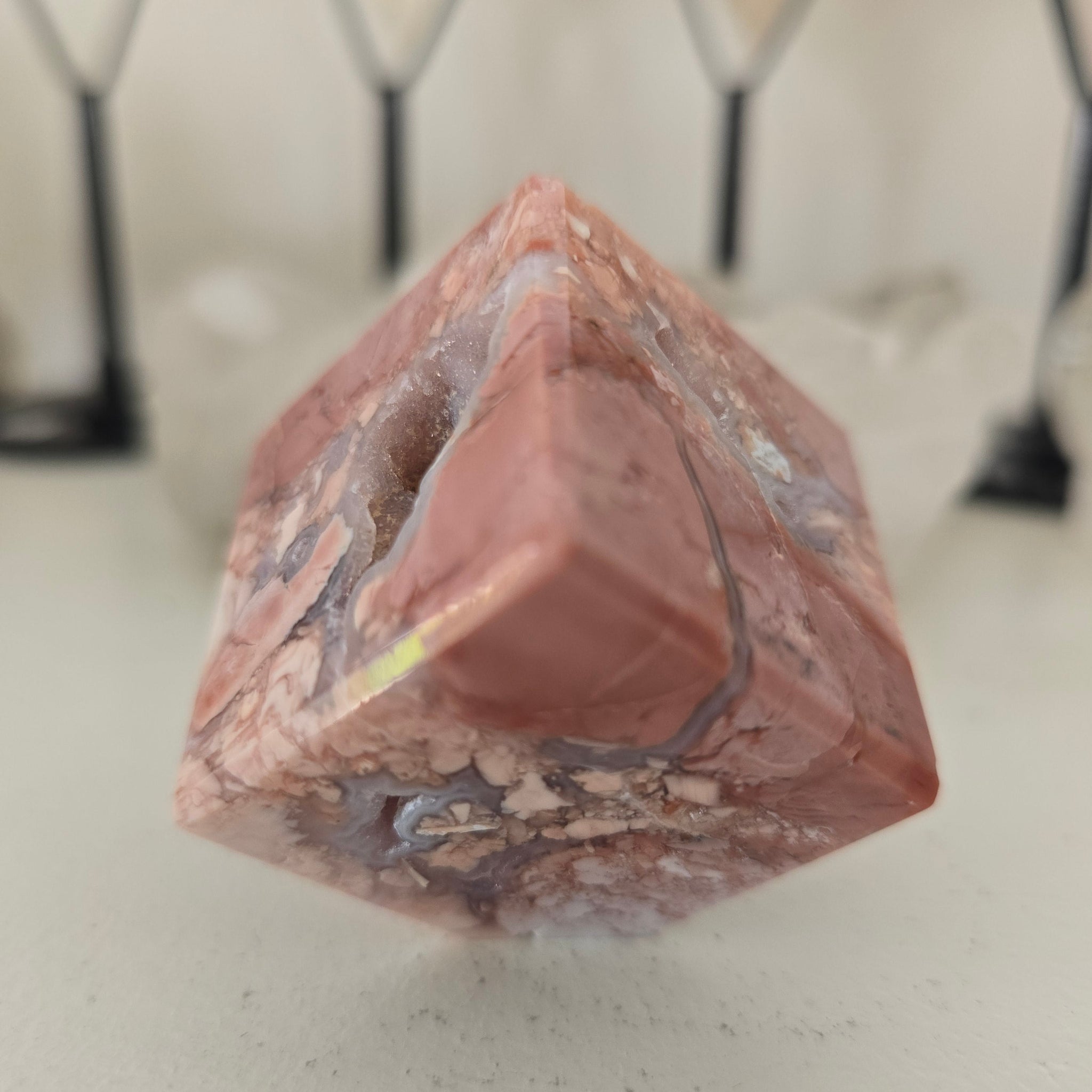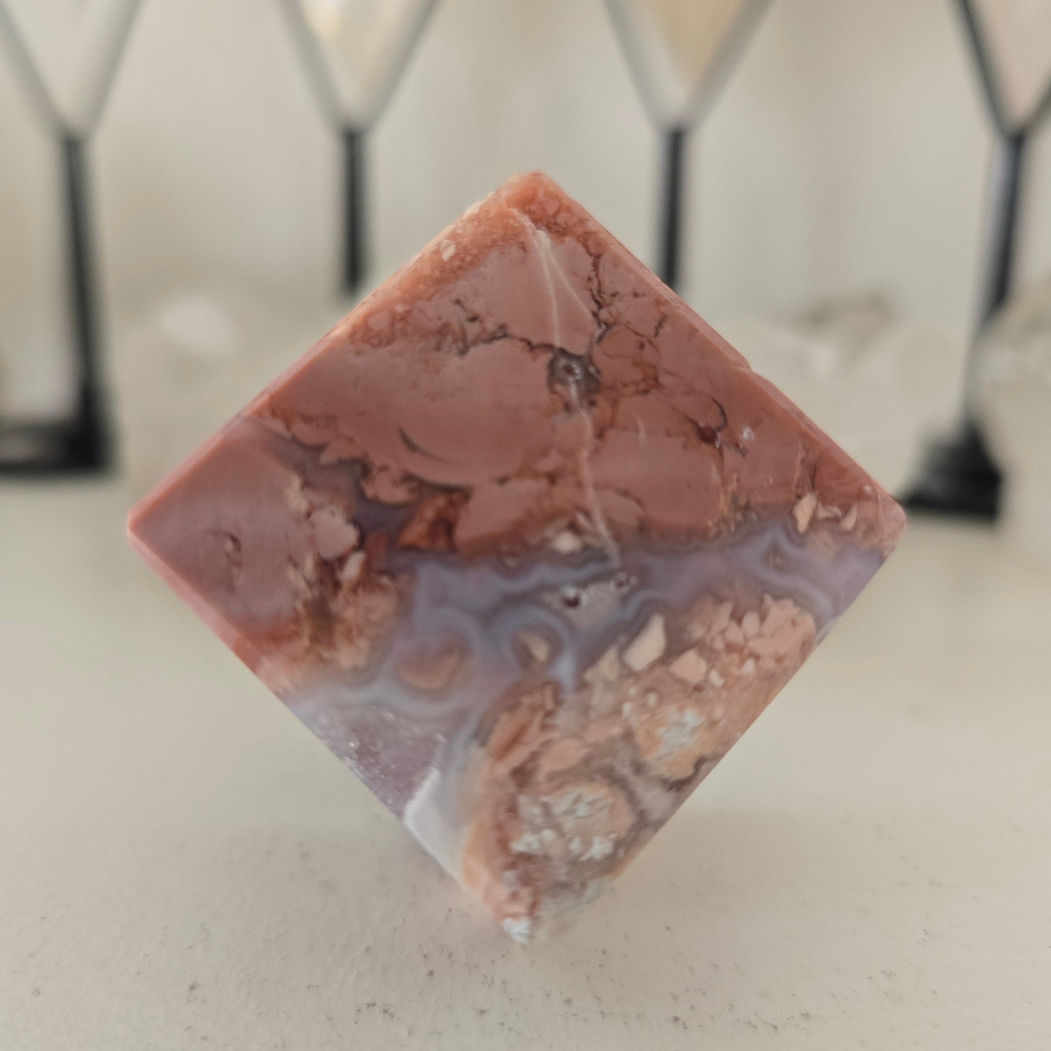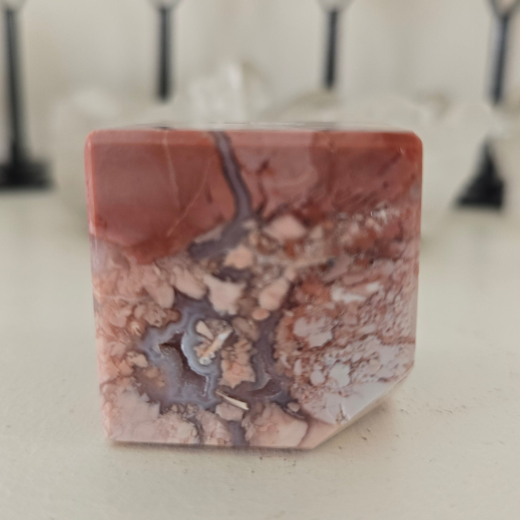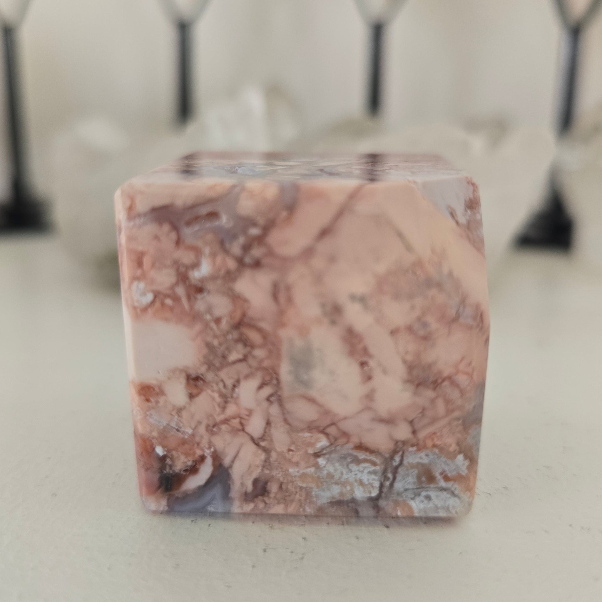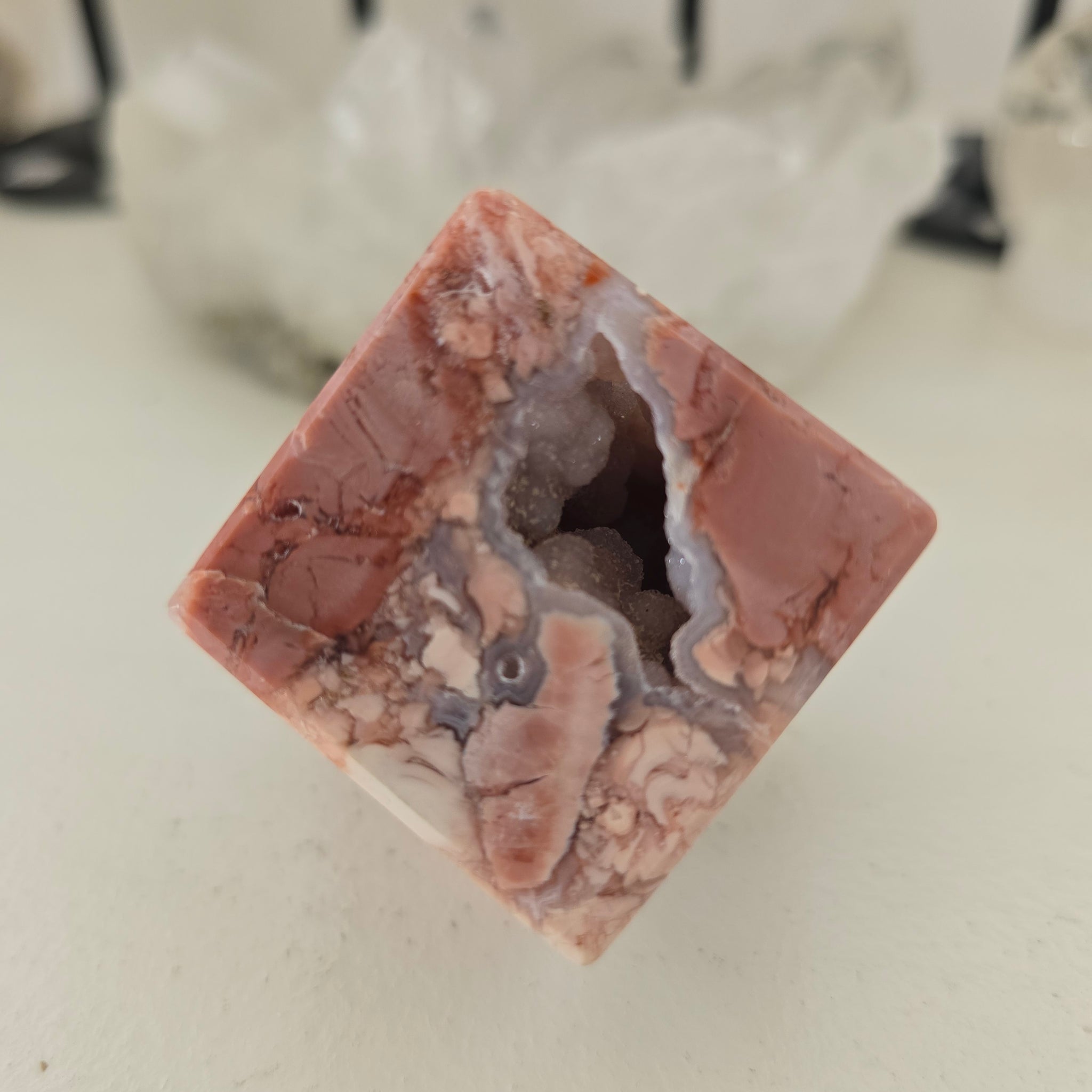 This pretty Pink Agate Spinning Cube has druzy pockets and is approximately 99 g - 3.25 cm square.