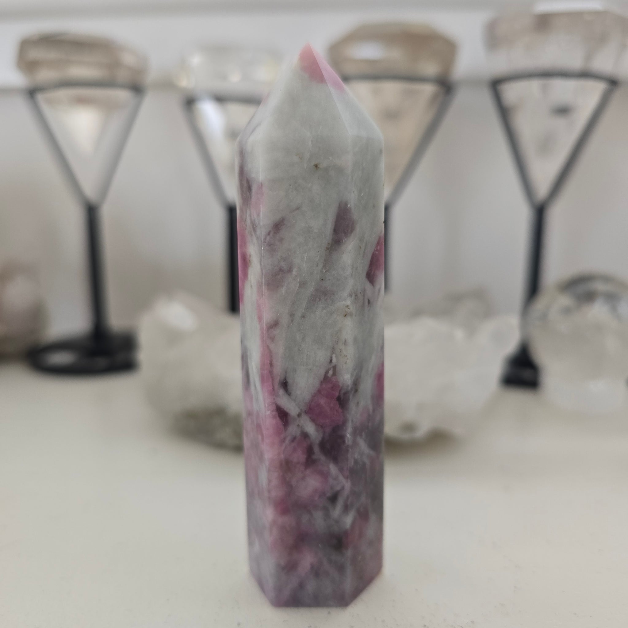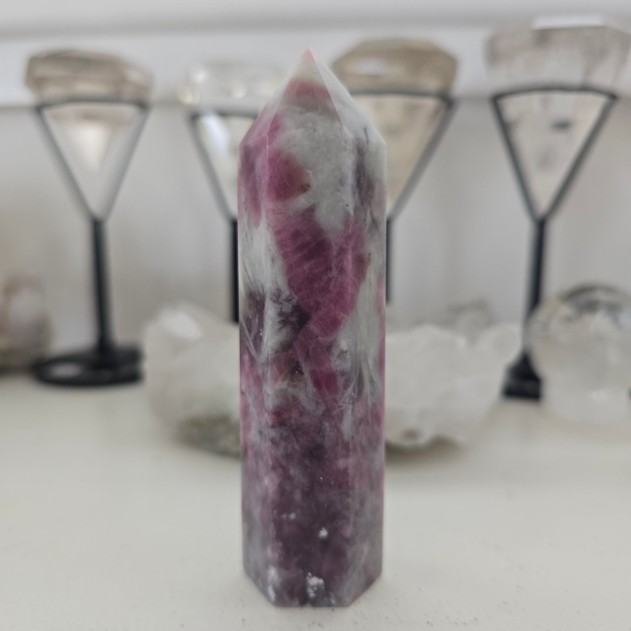 This Pink Tourmaline in Quartz Tower is 104 g - approx.- 9.5 x 2.5 x 2.5 cm. It has 6 sides.