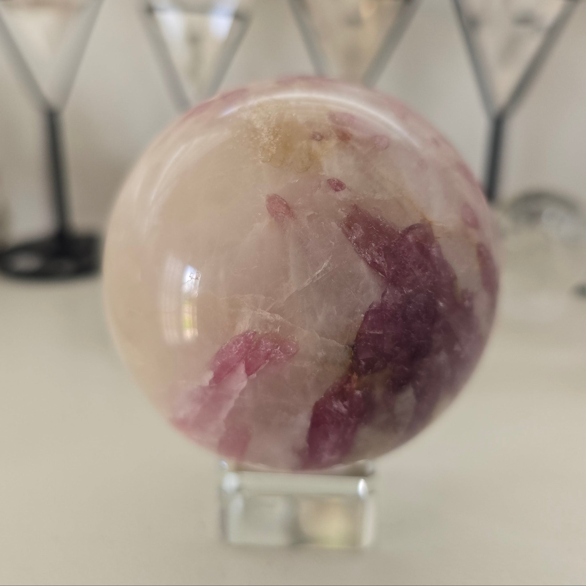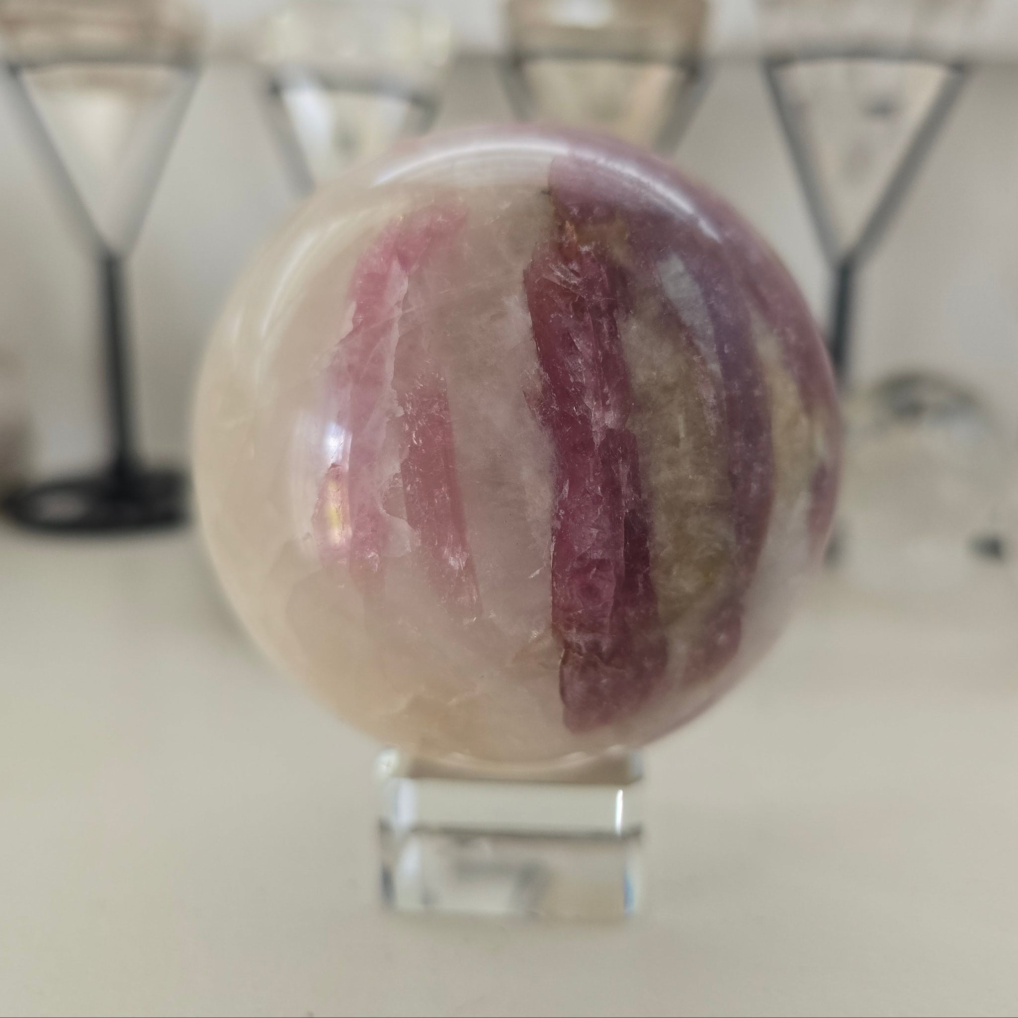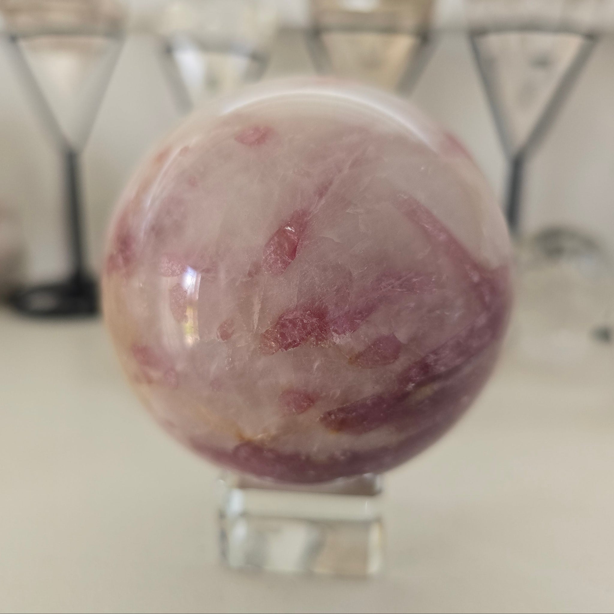 This beautiful Pink Tourmaline Sphere is approx. 6.25 cm in diameter - 490 g. (Glass stand is not included).