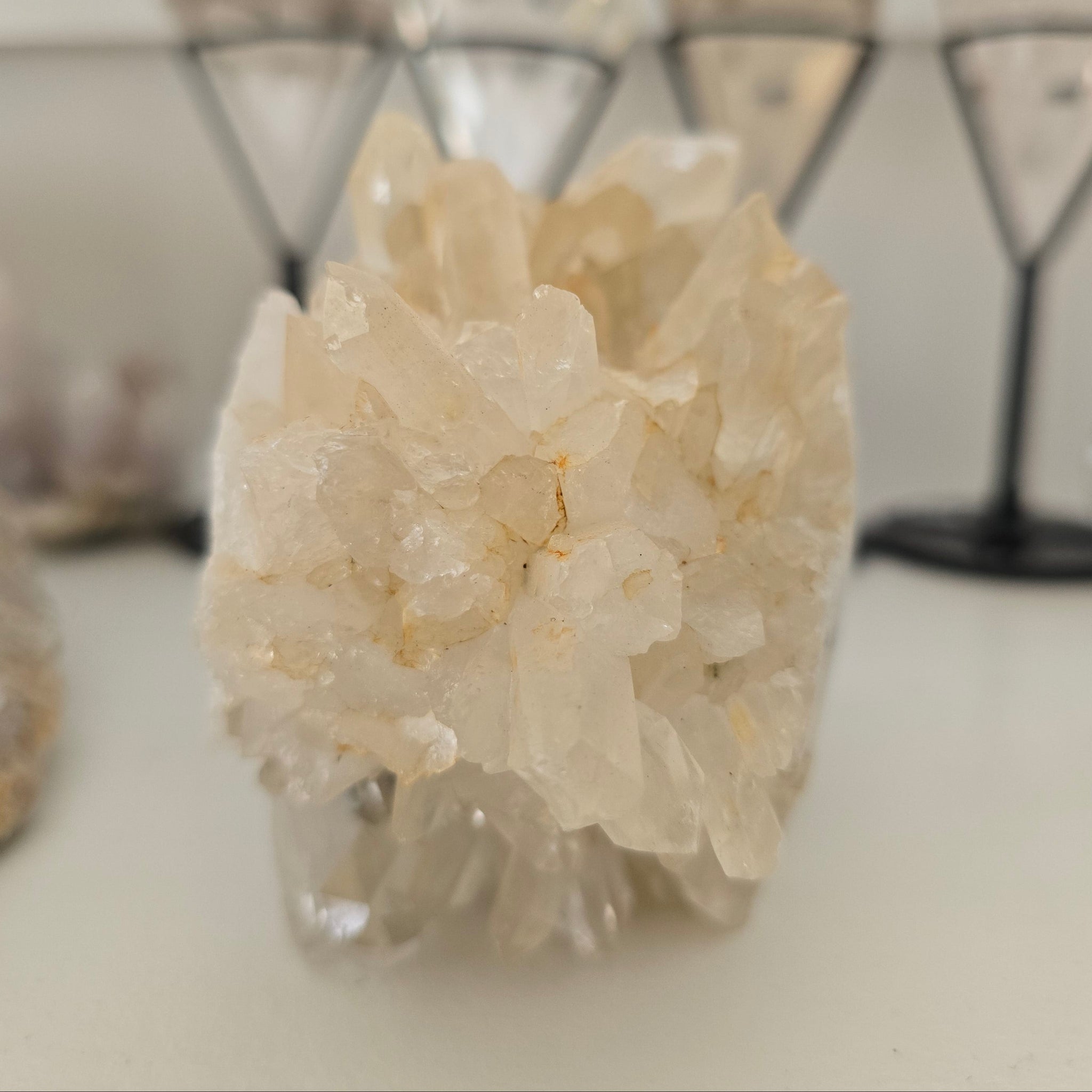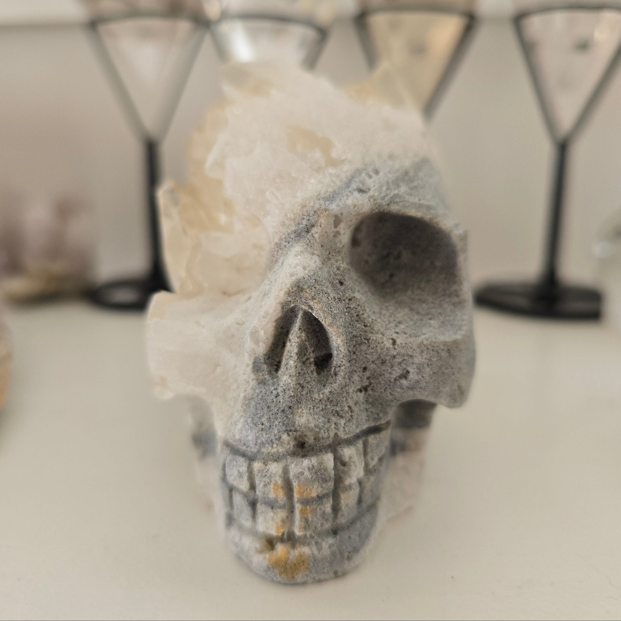 This Quartz Cluster Stone Skull has beautiful big chunky points and a gorgeous Rainbow. It is 645 g. Approximately 11 x 7.5 x 5.5.cm.