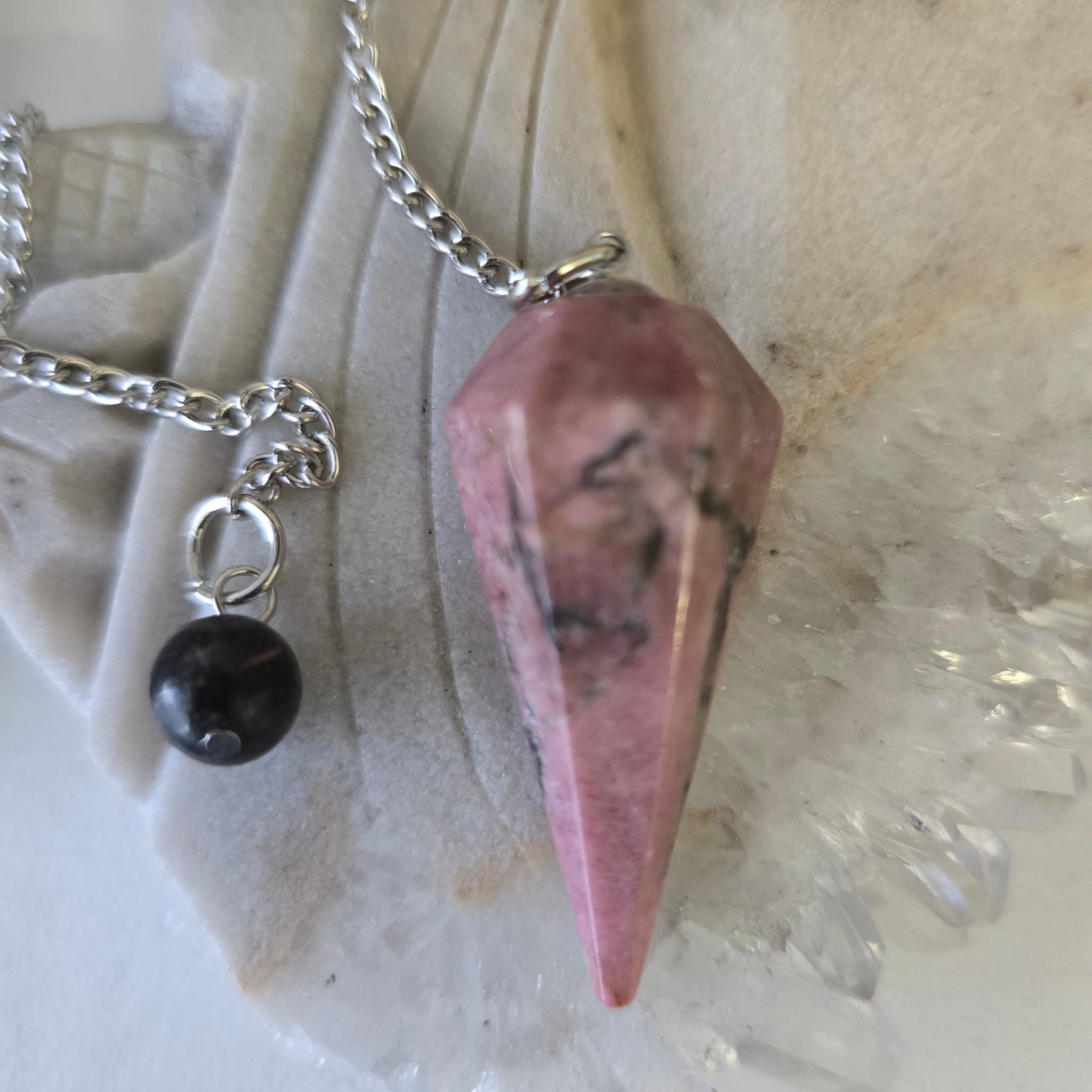 A natural Rhodonite crystal has been well polished and cut into a cone shape with terminated point at the end.The crystal cone pendulum has a sliver chain.