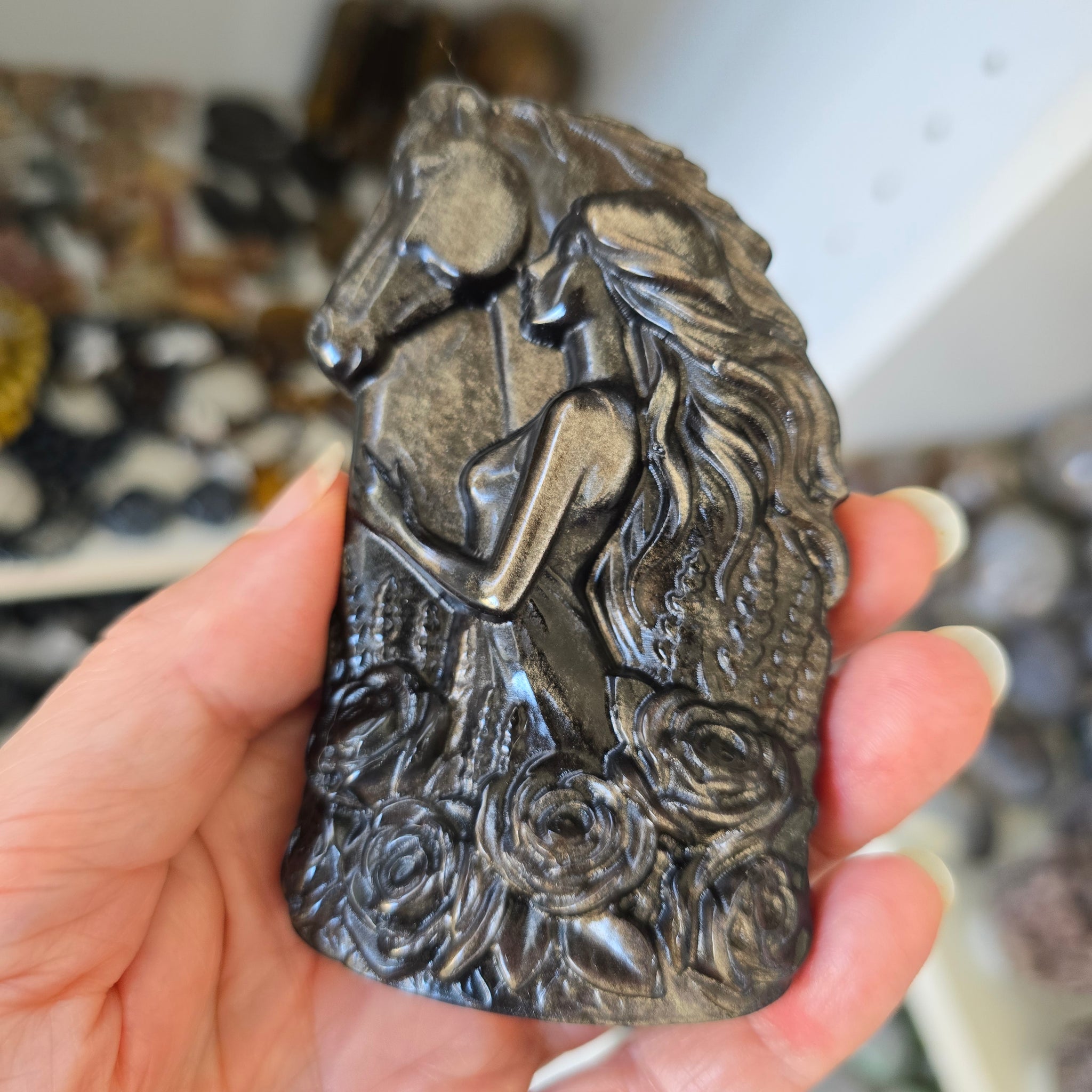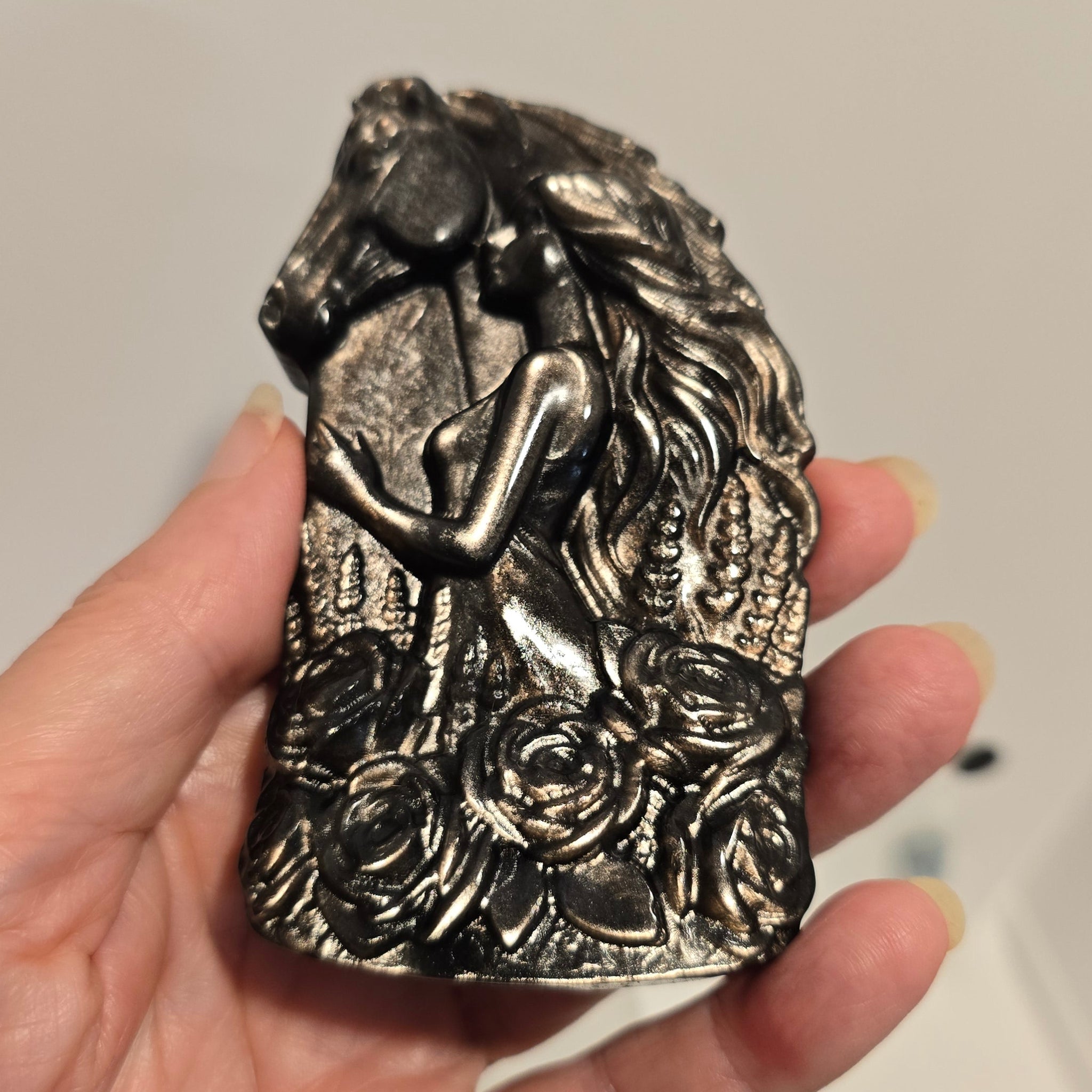 This beautifully carved Silver Sheen Obsidian Floral Lady with Horse is approximately 143 g. - 10 x 5 x 1 cm.