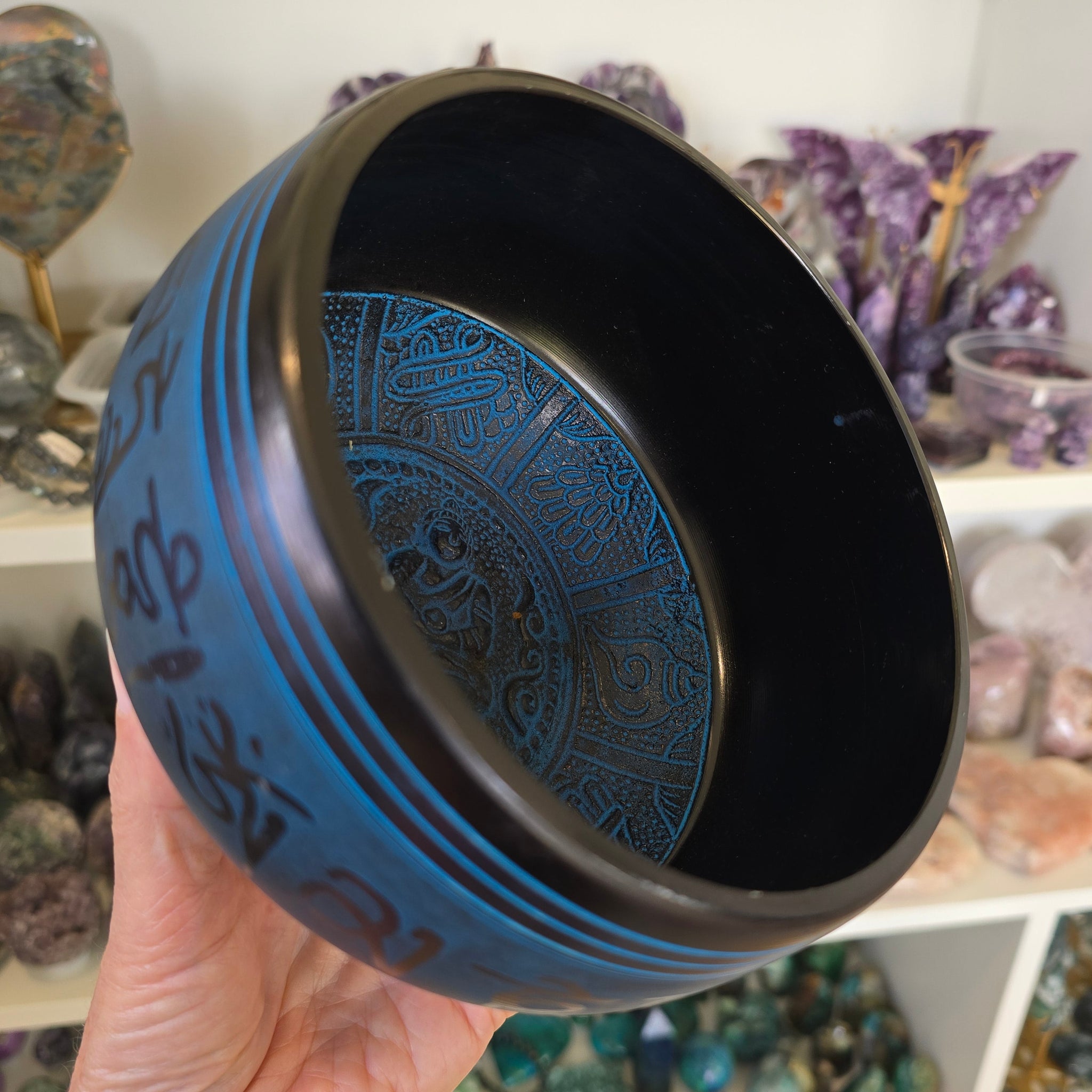 This singing bowl has a beautiful raised etched Buddha inside with symbols around the outside. It is a rustic blue colour, made from aluminium and is14 cm in diameter. Comes with the mallet and comes boxed.