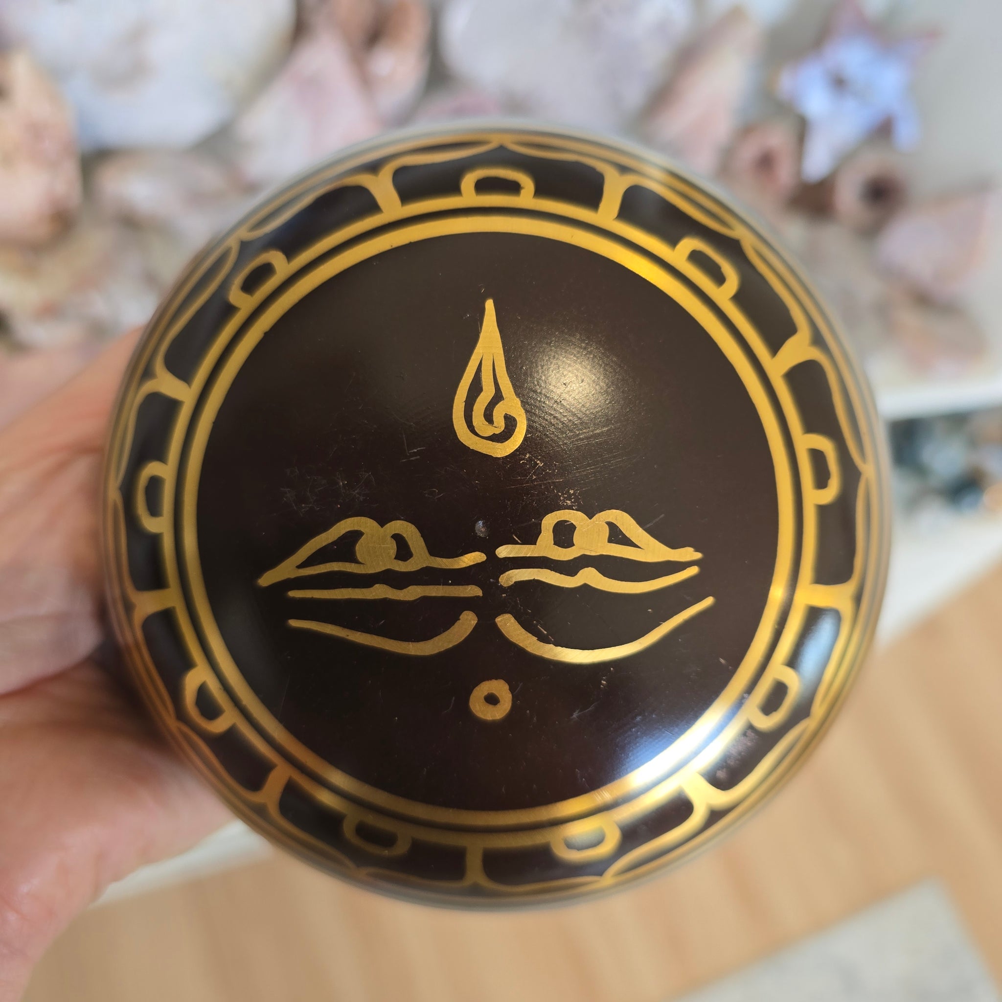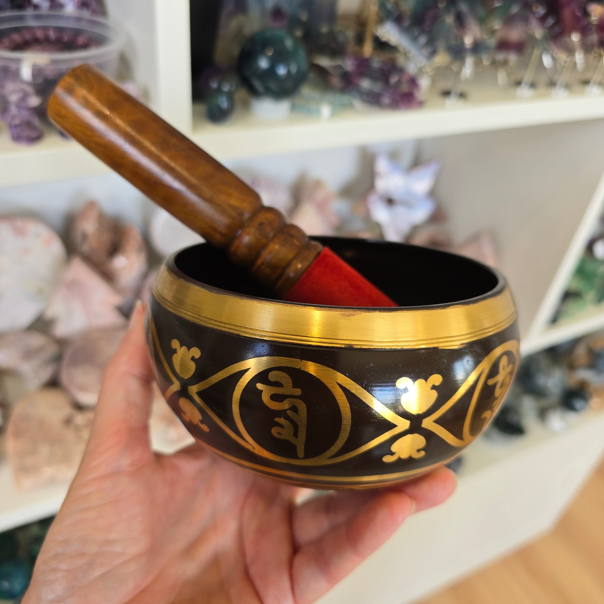 This singing bowl has a gold-coloured Tree of Life etched inside with symbols around the outside. It is a rustic black/brown colour and is12 cm in diameter. It comes with the mallet and comes boxed.