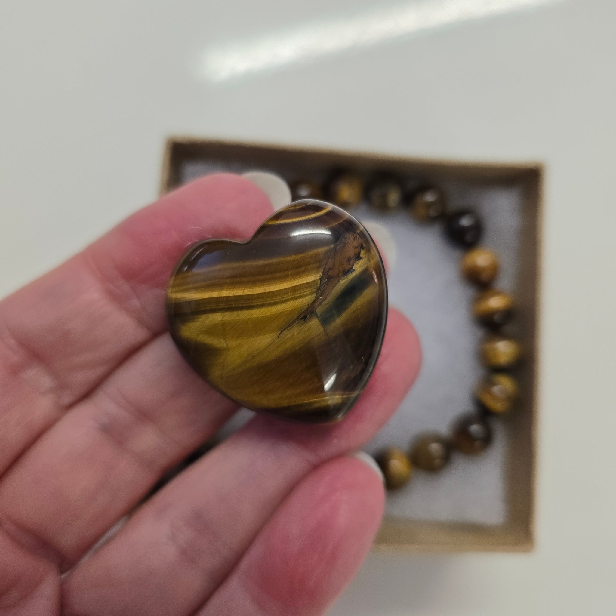 This beautiful gift set contains a natural Tiger’s Eye bracelet and Tiger’s Eye heart all in a small box. (A brief description of each crystal and it’s properties included). The bracelet is elastised and fits most wrists. The beads are 8 mm Tiger’s Eye gemstones and a small Tiger’s Eye puff pocket heart.